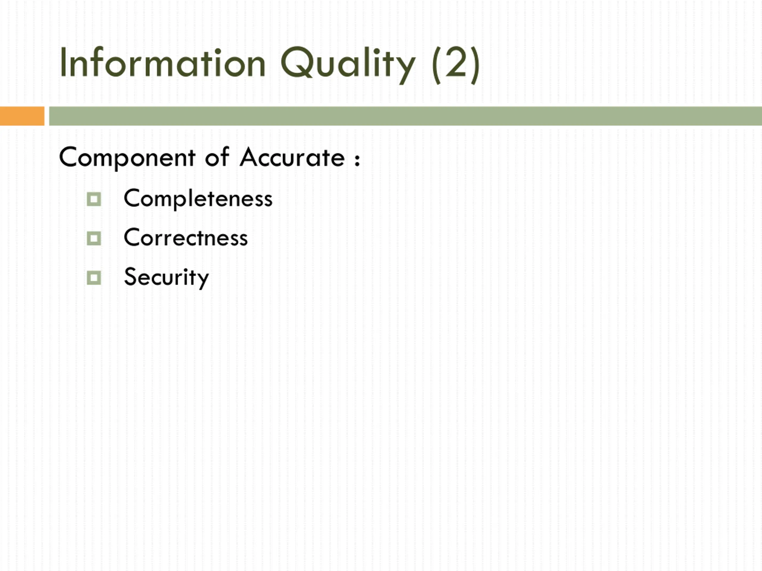 Information Quality (2) Component of Accurate : Completeness Correctness Security