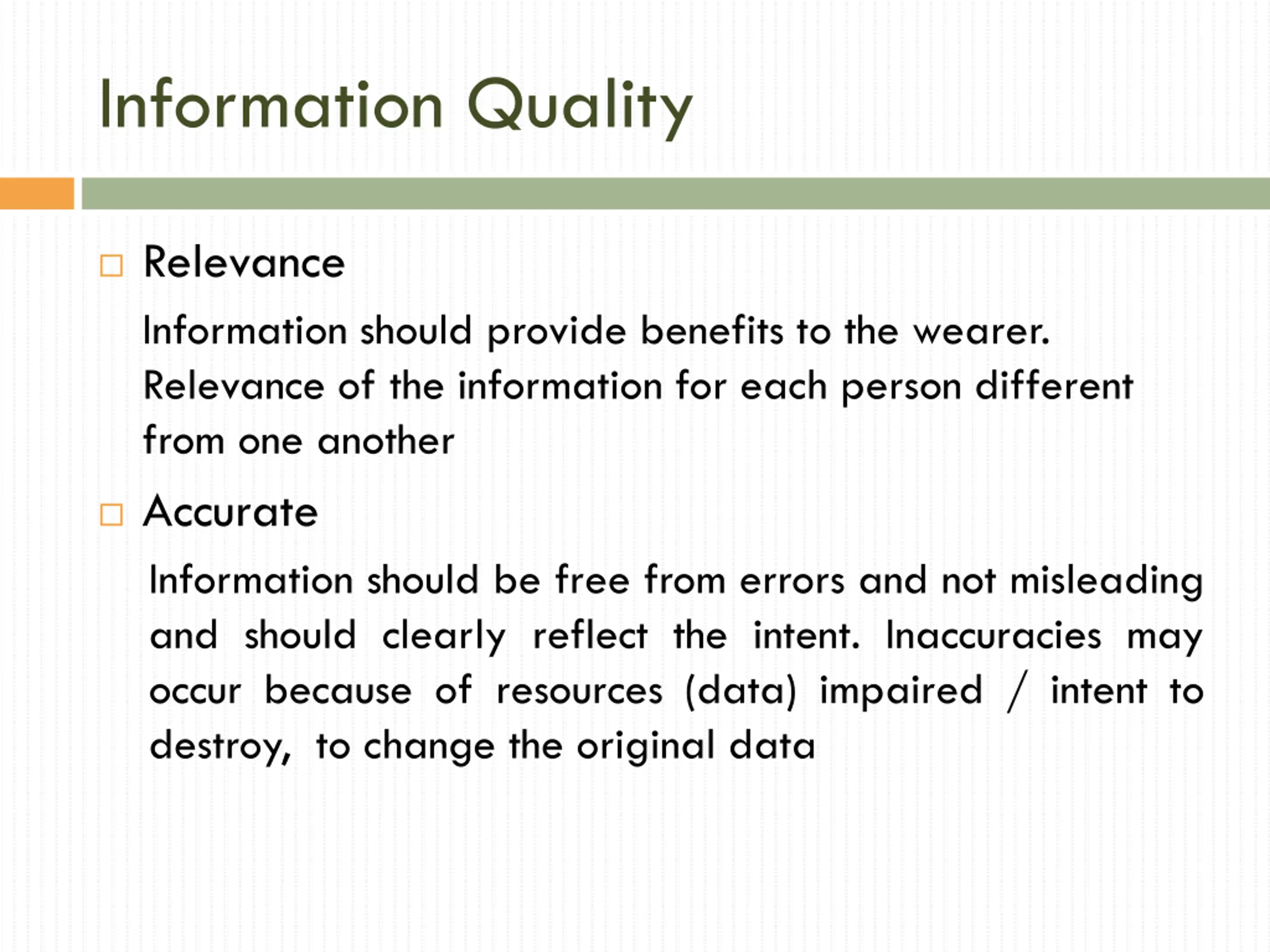 Information Quality Relevance Information should provide benefits to the wearer. Relevance of the information for each person different from one another Accurate Information should be free from errors and not misleading and should clearly reflect the intent. Inaccuracies may occur because of resources (data) impaired / intent to destroy, to change the original data