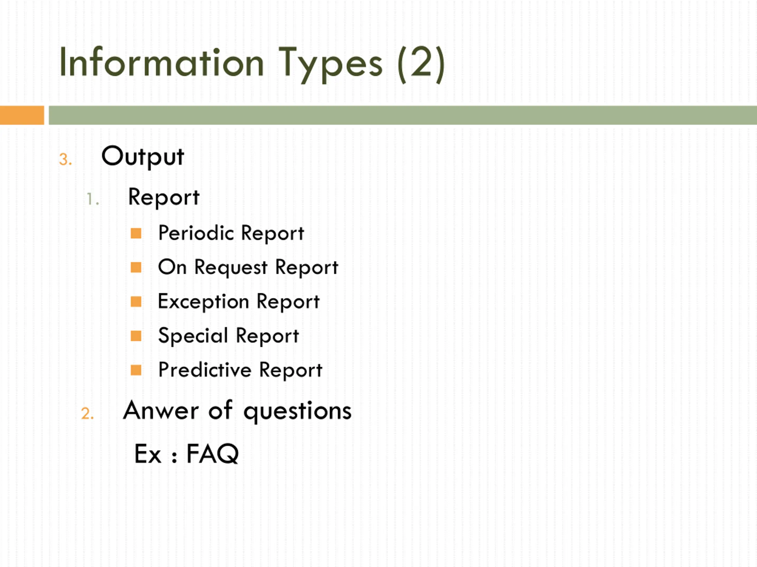 Information Types (2) Output Report Periodic Report On Request Report Exception Report Special Report Predictive Report Anwer of questions Ex : FAQ 3. 1. 2.