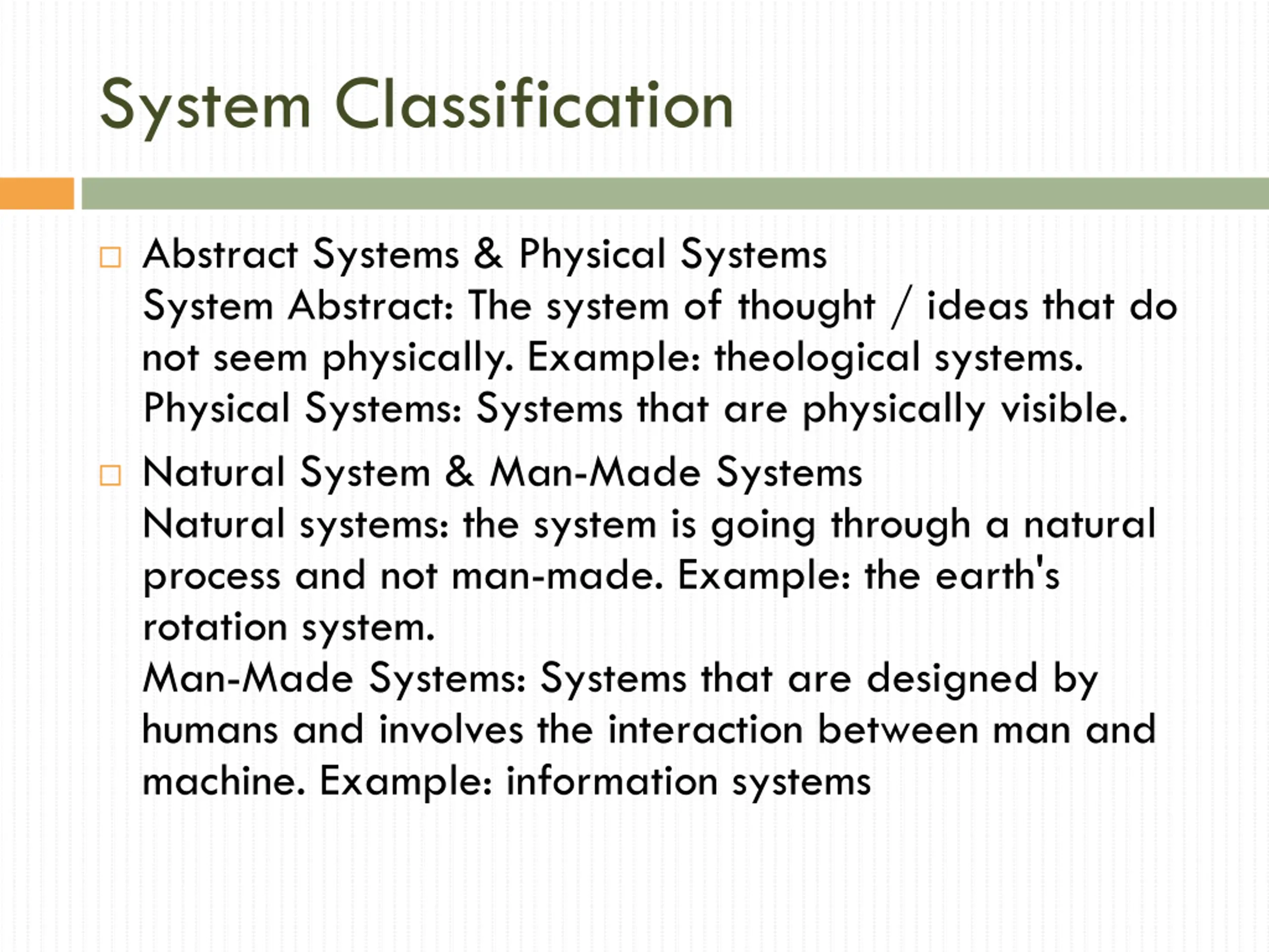 System Classification Abstract Systems & Physical Systems System Abstract: The system of thought / ideas that do not seem physically. Example: theological systems. Physical Systems: Systems that are physically visible. Natural System & Man-Made Systems Natural systems: the system is going through a natural process and not man-made. Example: the earth's rotation system. Man-Made Systems: Systems that are designed by humans and involves the interaction between man and machine. Example: information systems