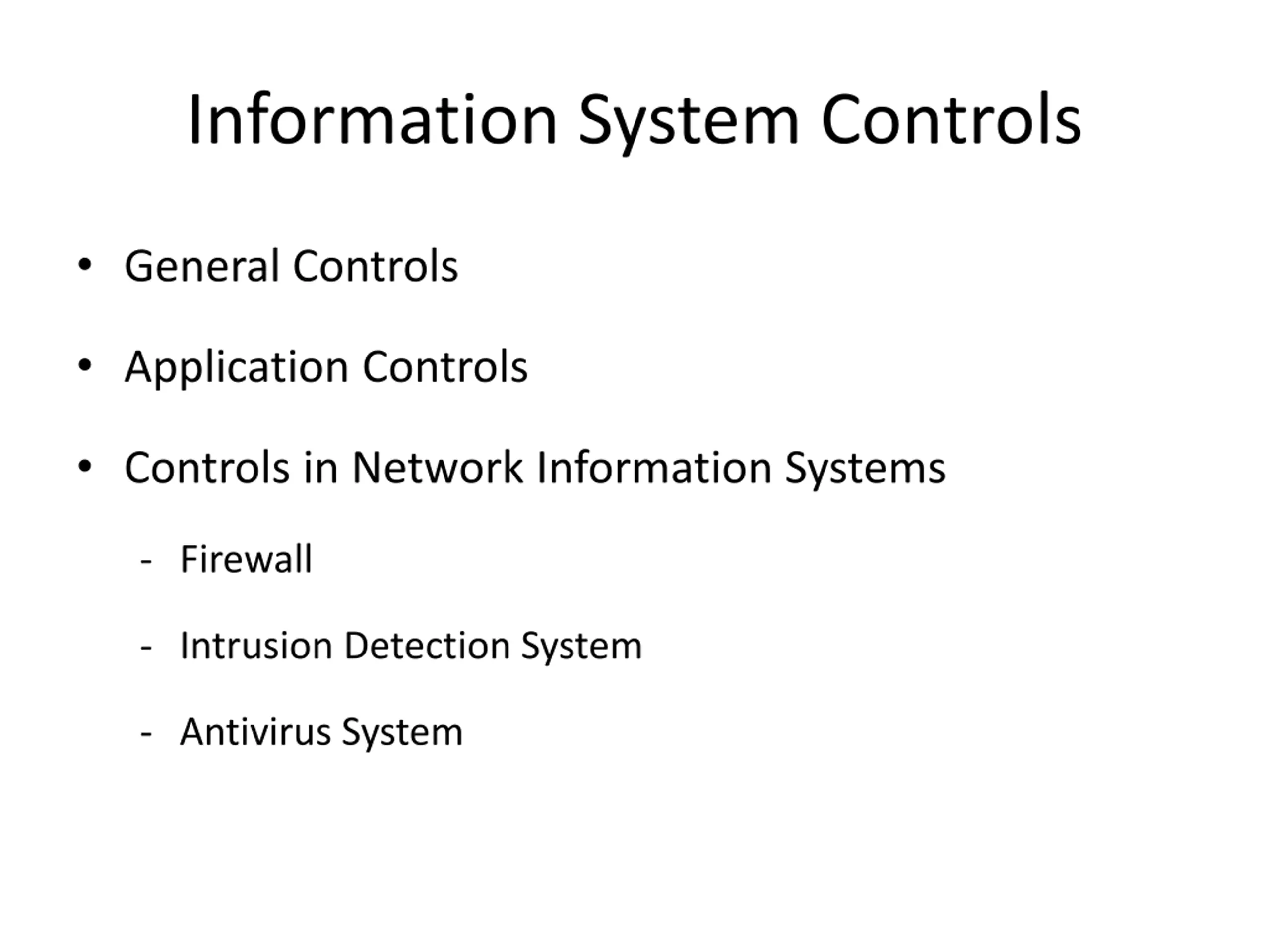 Information System Controls General Controls Application Controls Controls in Network Information Systems - Firewall - Intrusion Detection System - Antivirus System