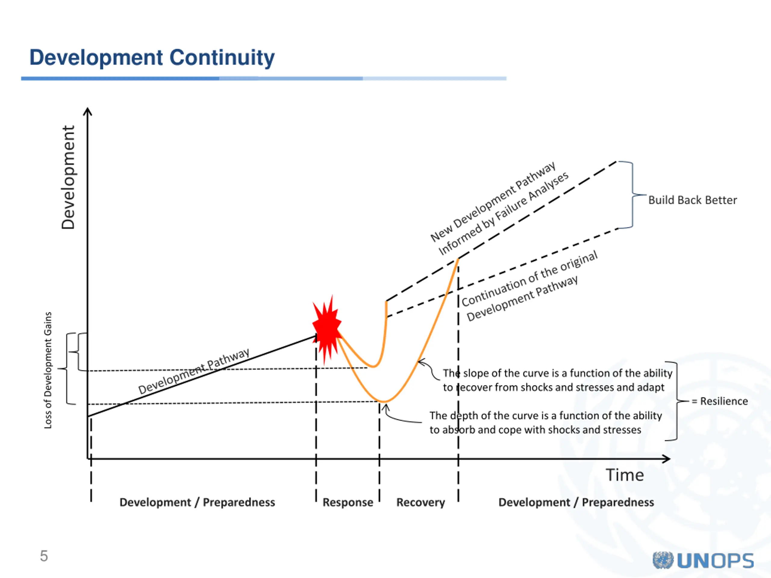Development Continuity Development Build Back Better Loss of Development Gains The slope of the curve is a function of the ability to recover from shocks and stresses and adapt = Resilience The depth of the curve is a function of the ability to absorb and cope with shocks and stresses Time Development / Preparedness Response Recovery Development / Preparedness 5
