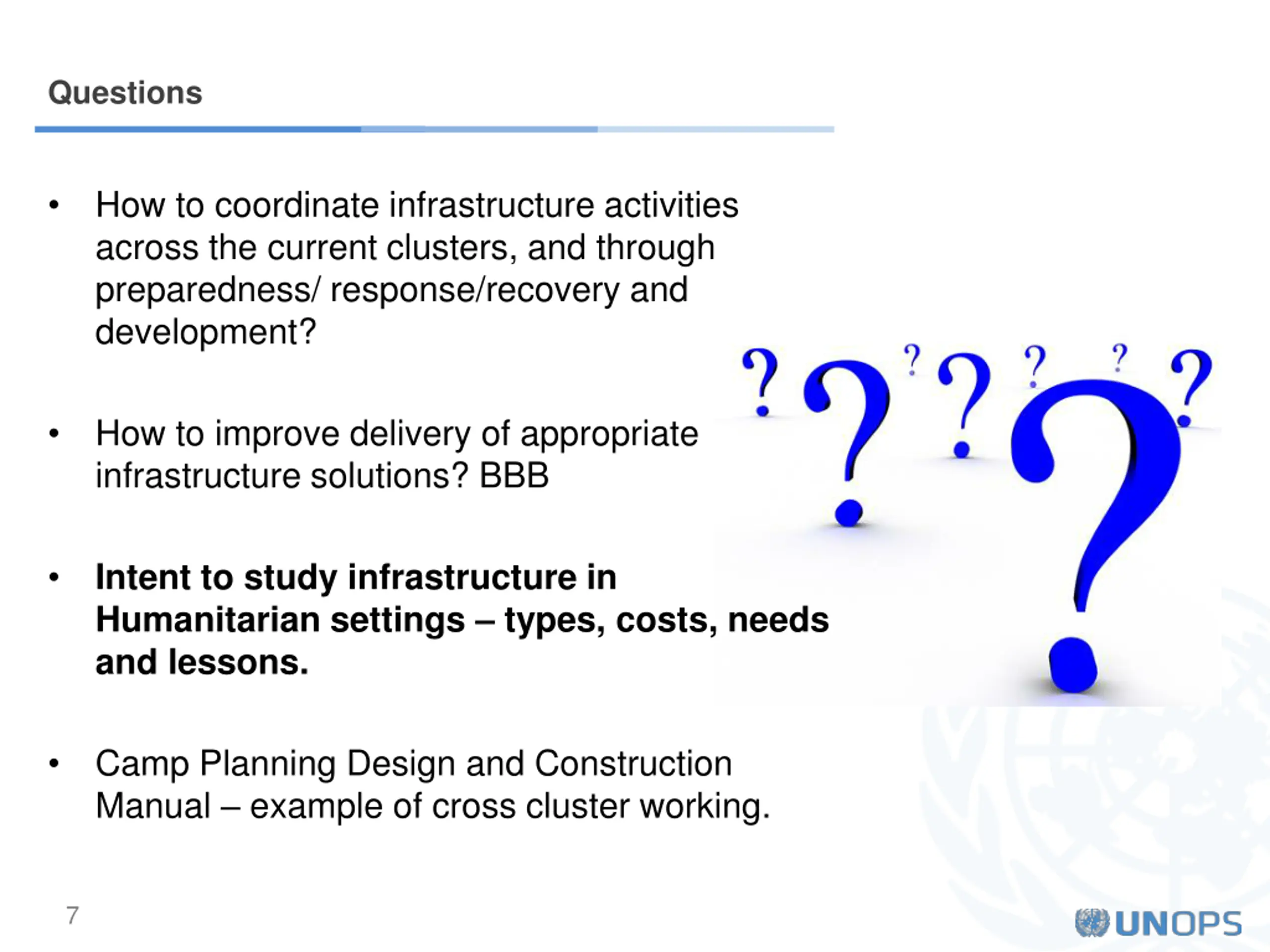 Infrastructure key points Systems approach needed to ensure efficiency, assure functionality, making right early decisions for long term benefit. Infrastructure cuts across clusters / sectors. Encourages and needs coordination in planning and implementation In infrastructure two important areas: Preparedness (mitigation and adaptation) + Recovery (Build Back Better) Better Development Reduced response need 6