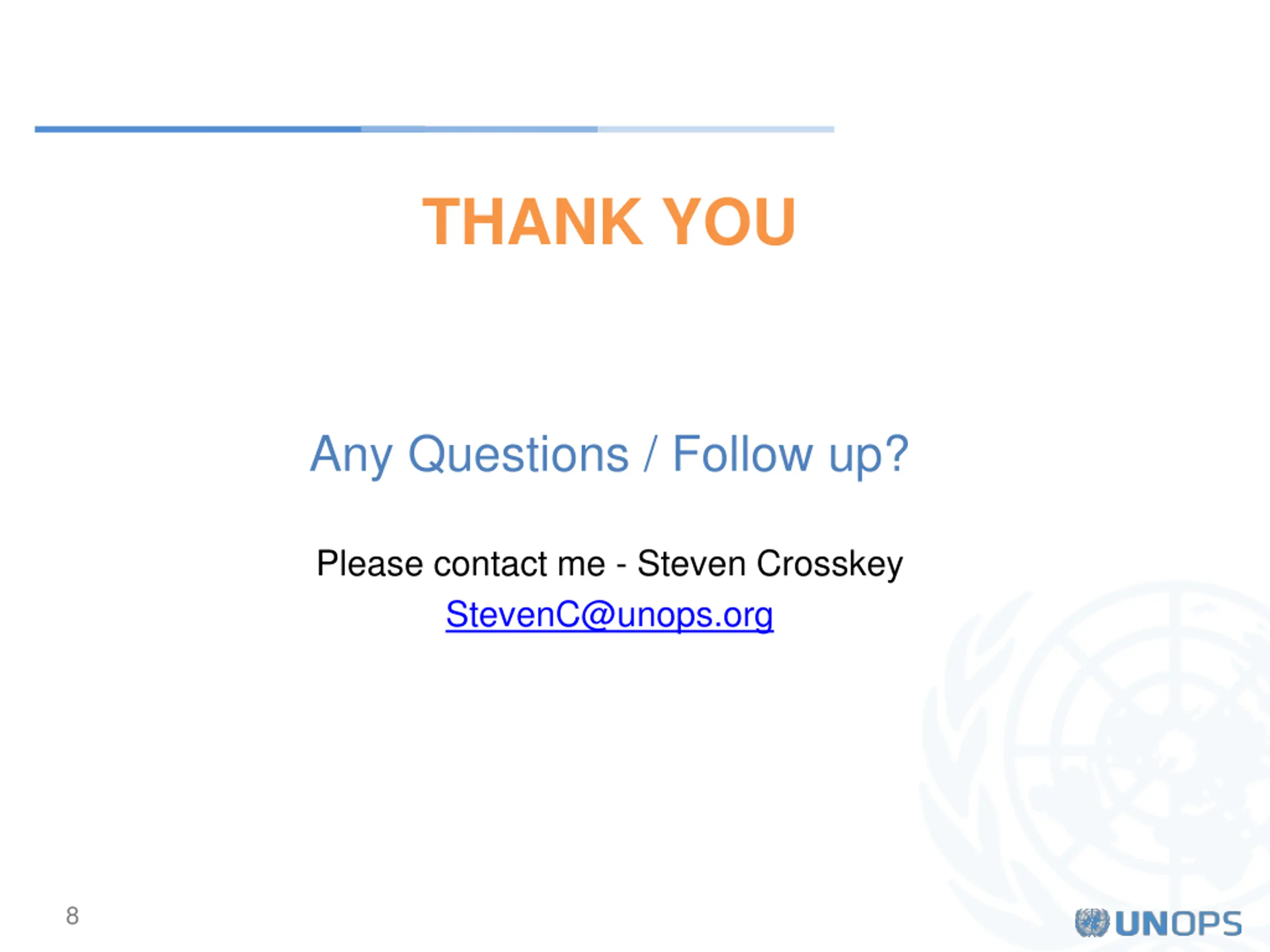 THANK YOU Any Questions / Follow up? Please contact me - Steven Crosskey StevenC@unops.org 8