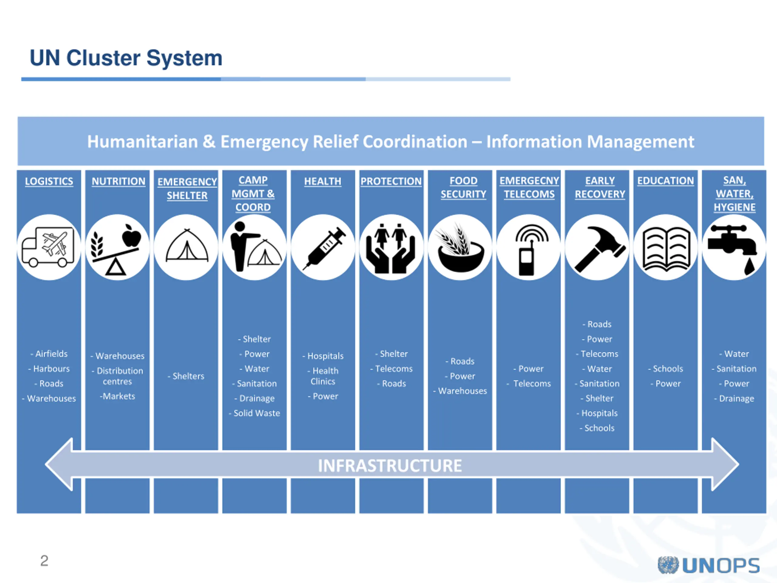 UN Cluster System Humanitarian & Emergency Relief Coordination Information Management CAMP MGMT & COORD SAN, WATER, HYGIENE FOOD SECURITY EMERGECNY TELECOMS EARLY RECOVERY EDUCATION LOGISTICS NUTRITION HEALTH PROTECTION EMERGENCY SHELTER - Roads - Shelter - Power - Airfields - Shelter - Water - Telecoms - Power - Warehouses - Hospitals - Roads - Power - Schools - Water - Harbours - Telecoms - Sanitation - Water - Distribution centres - Health Clinics - Shelters - Power - Roads - Roads - Power - Sanitation - Telecoms - Power - Sanitation - Warehouses -Markets - Power - Shelter - Drainage - Warehouses - Drainage - Solid Waste - Hospitals - Schools INFRASTRUCTURE 2
