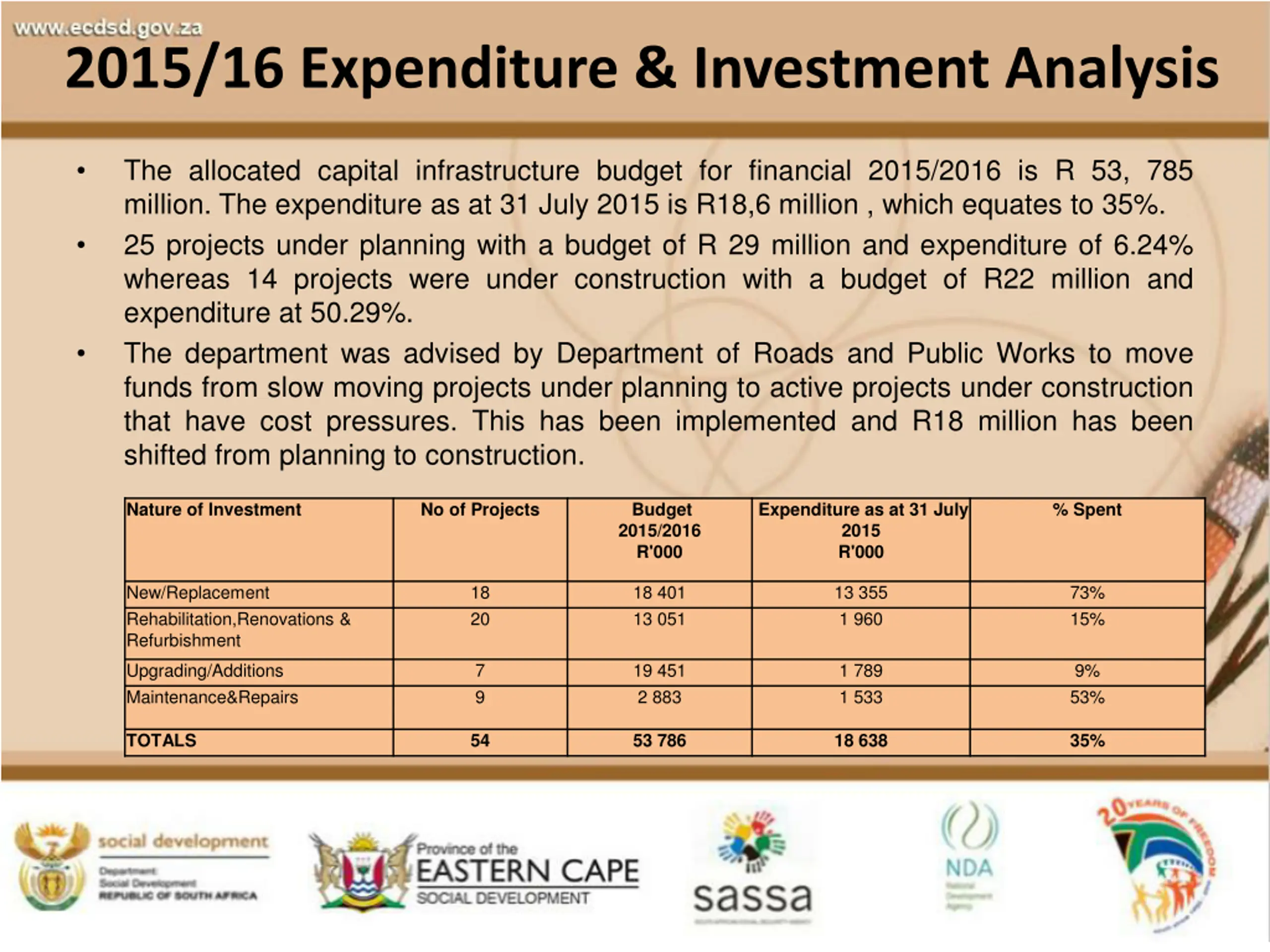 2015/16 Expenditure & Investment Analysis The allocated capital infrastructure budget for financial 2015/2016 is R 53, 785 million. The expenditure as at 31 July 2015 is R18,6 million , which equates to 35%. 25 projects under planning with a budget of R 29 million and expenditure of 6.24% whereas 14 projects were under construction with a budget of R22 million and expenditure at 50.29%. The department was advised by Department of Roads and Public Works to move funds from slow moving projects under planning to active projects under construction that have cost pressures. This has been implemented and R18 million has been shifted from planning to construction. Nature of Investment No of Projects Budget 2015/2016 R'000 Expenditure as at 31 July 2015 R'000 % Spent New/Replacement Rehabilitation,Renovations & Refurbishment 18 20 18 401 13 051 13 355 1 960 73% 15% Upgrading/Additions Maintenance&Repairs 7 9 19 451 2 883 1 789 1 533 9% 53% TOTALS 54 53 786 18 638 35%