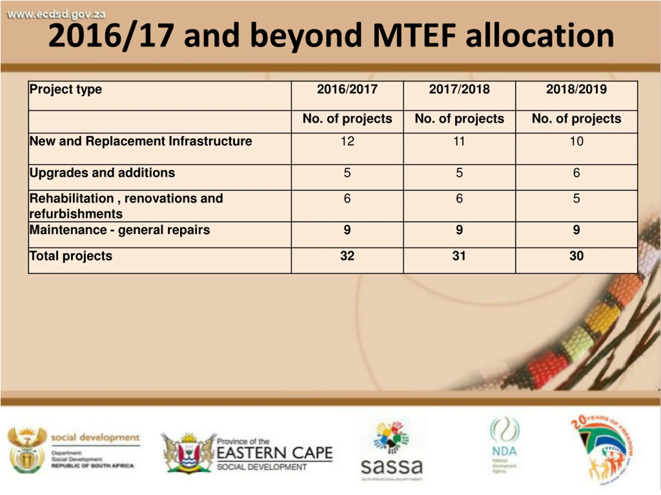 2016/17 and beyond MTEF allocation Project type 2016/2017 2017/2018 2018/2019 No. of projects No. of projects No. of projects 12 11 10 New and Replacement Infrastructure 5 5 6 Upgrades and additions 6 6 5 Rehabilitation , renovations and refurbishments Maintenance - general repairs 9 9 9 Total projects 32 31 30