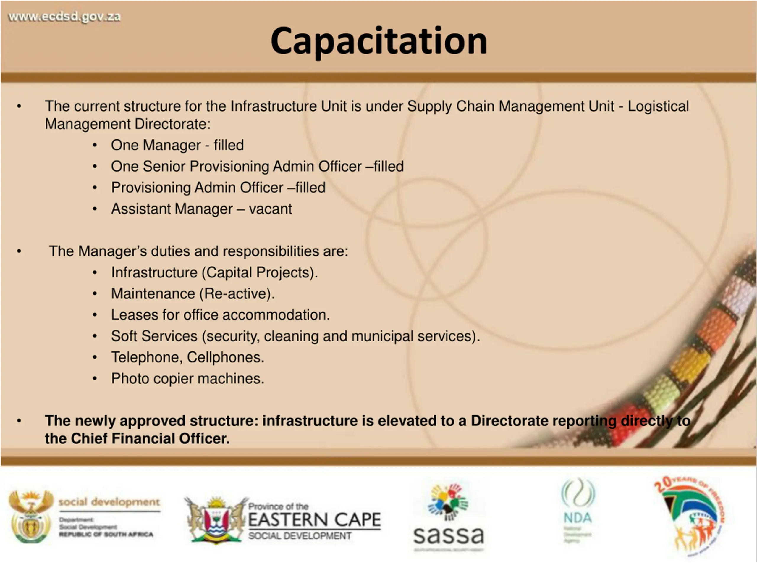 Capacitation The current structure for the Infrastructure Unit is under Supply Chain Management Unit - Logistical Management Directorate: One Manager - filled One Senior Provisioning Admin Officer filled Provisioning Admin Officer filled Assistant Manager vacant The Manager s duties and responsibilities are: Infrastructure (Capital Projects). Maintenance (Re-active). Leases for office accommodation. Soft Services (security, cleaning and municipal services). Telephone, Cellphones. Photo copier machines. The newly approved structure: infrastructure is elevated to a Directorate reporting directly to the Chief Financial Officer.