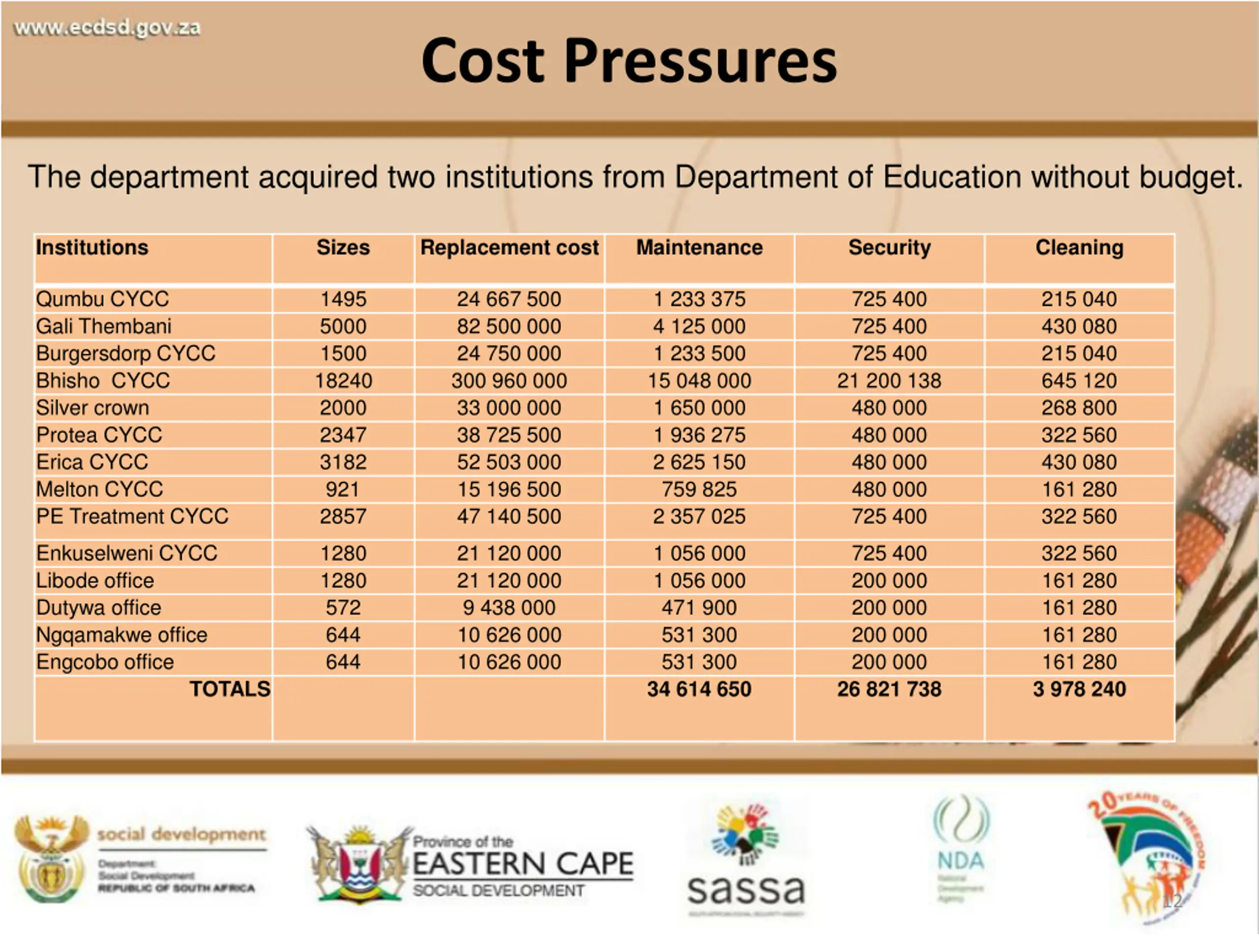 Cost Pressures The department acquired two institutions from Department of Education without budget. Institutions Sizes Replacement cost Maintenance Security Cleaning Qumbu CYCC Gali Thembani Burgersdorp CYCC Bhisho CYCC Silver crown Protea CYCC Erica CYCC Melton CYCC PE Treatment CYCC 1495 5000 1500 18240 2000 2347 3182 921 2857 24 667 500 82 500 000 24 750 000 300 960 000 33 000 000 38 725 500 52 503 000 15 196 500 47 140 500 1 233 375 4 125 000 1 233 500 15 048 000 1 650 000 1 936 275 2 625 150 759 825 2 357 025 725 400 725 400 725 400 21 200 138 480 000 480 000 480 000 480 000 725 400 215 040 430 080 215 040 645 120 268 800 322 560 430 080 161 280 322 560 Enkuselweni CYCC Libode office Dutywa office Ngqamakwe office Engcobo office 1280 1280 572 644 644 21 120 000 21 120 000 9 438 000 10 626 000 10 626 000 1 056 000 1 056 000 471 900 531 300 531 300 34 614 650 725 400 200 000 200 000 200 000 200 000 26 821 738 322 560 161 280 161 280 161 280 161 280 3 978 240 TOTALS 12
