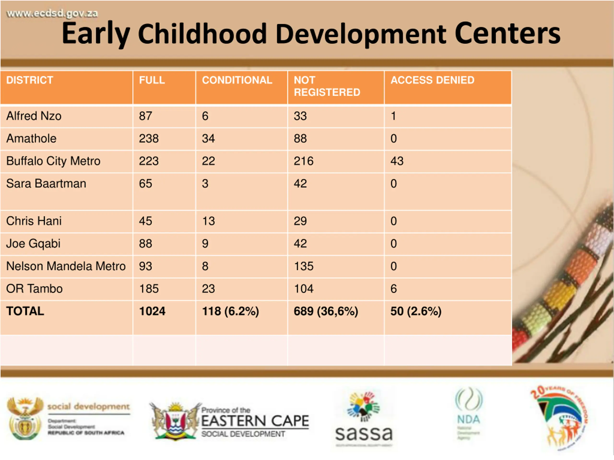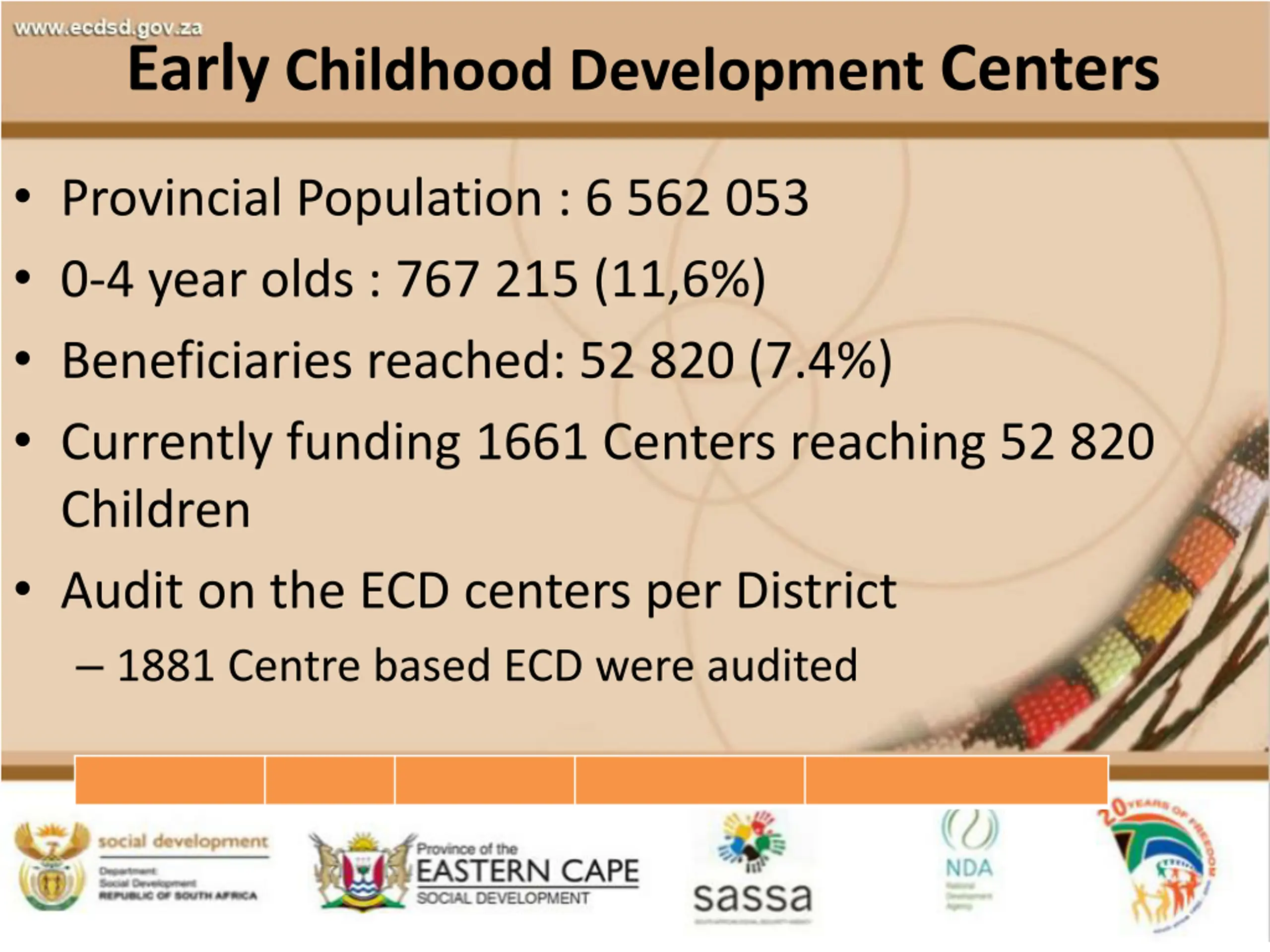 Early Childhood Development Centers Provincial Population : 6 562 053 0-4 year olds : 767 215 (11,6%) Beneficiaries reached: 52 820 (7.4%) Currently funding 1661 Centers reaching 52 820 Children Audit on the ECD centers per District 1881 Centre based ECD were audited