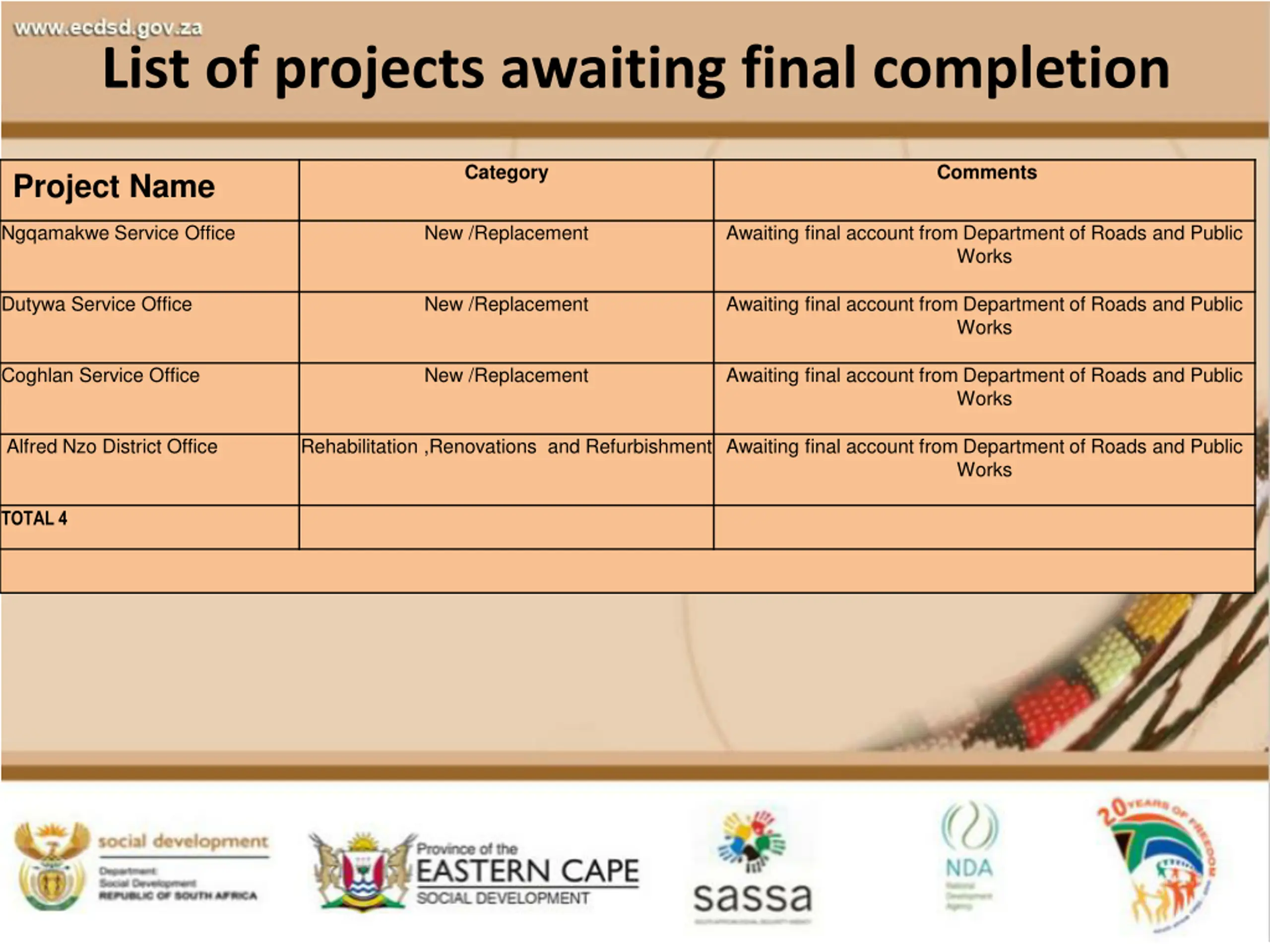List of projects awaiting final completion Category Comments Project Name Ngqamakwe Service Office New /Replacement Awaiting final account from Department of Roads and Public Works Dutywa Service Office New /Replacement Awaiting final account from Department of Roads and Public Works Coghlan Service Office New /Replacement Awaiting final account from Department of Roads and Public Works Alfred Nzo District Office Rehabilitation ,Renovations and Refurbishment Awaiting final account from Department of Roads and Public Works TOTAL 4