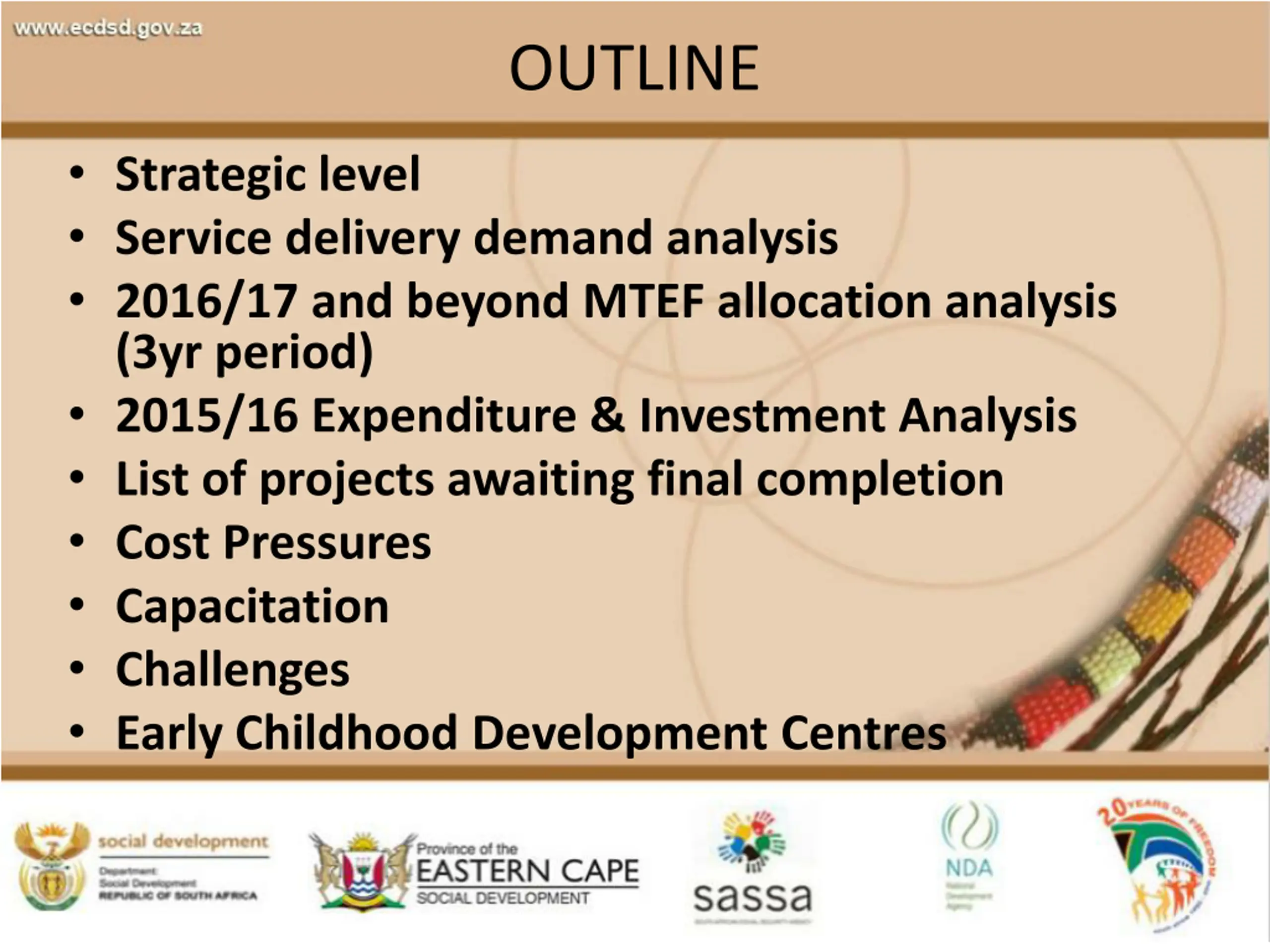 OUTLINE Strategic level Service delivery demand analysis 2016/17 and beyond MTEF allocation analysis (3yr period) 2015/16 Expenditure & Investment Analysis List of projects awaiting final completion Cost Pressures Capacitation Challenges Early Childhood Development Centres