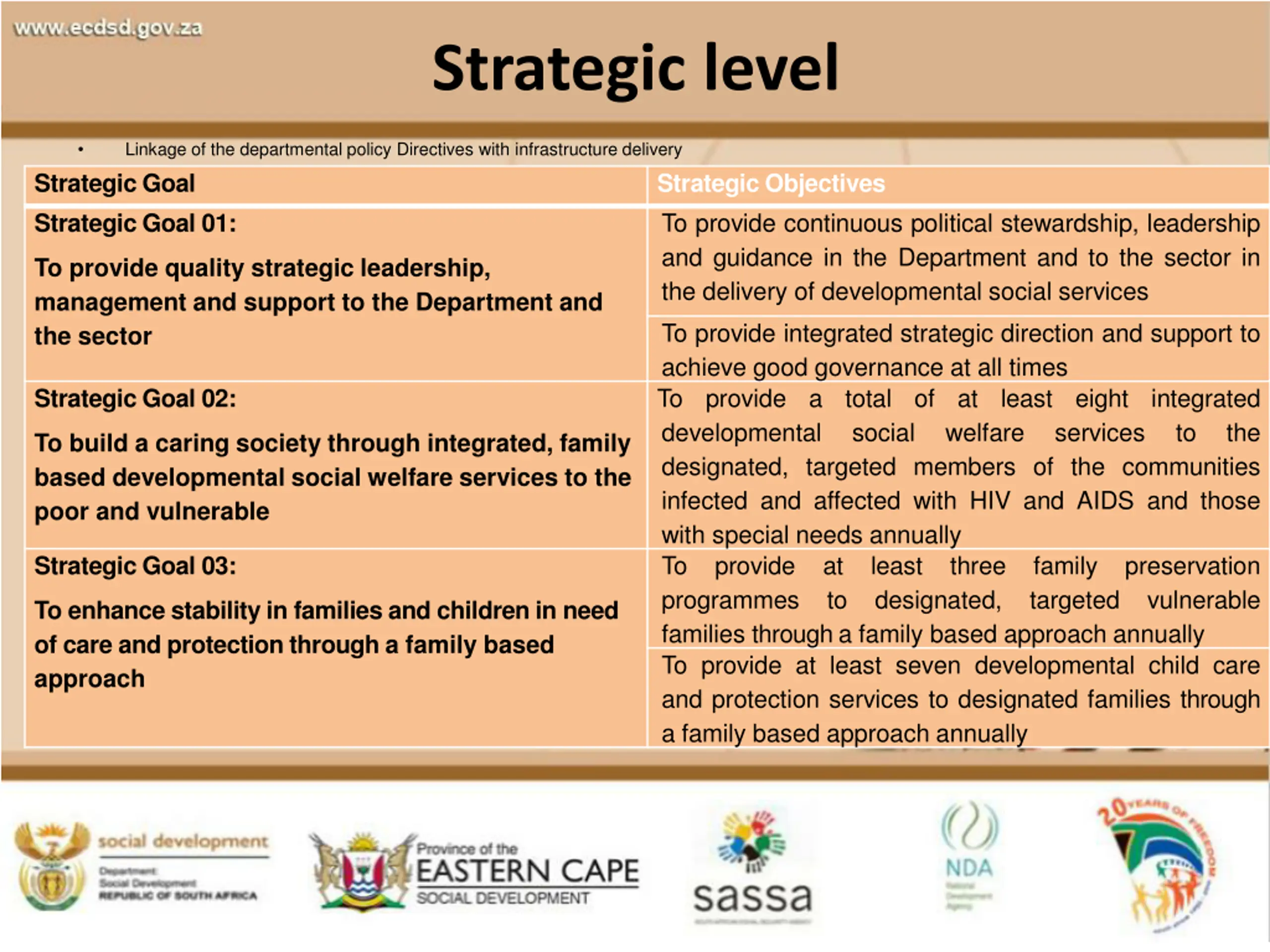 Strategic level Linkage of the departmental policy Directives with infrastructure delivery Strategic Goal Strategic Objectives To provide at least three integrated developmental social crime prevention, victim support and anti-substance abuse services to the most vulnerable members of communities through a family based approach annually Strategic Goal 04: To mitigate incidents of gender based violence, substance abuse and crime through a family based approach To provide a suite of community development services targeting poor communities and vulnerable groups particularly youth and women through a family based approach at all times Strategic Goal 05: To progressively build sustainable and self- reliant communities with special focus to all poor and vulnerable groups of the province through a family based approach