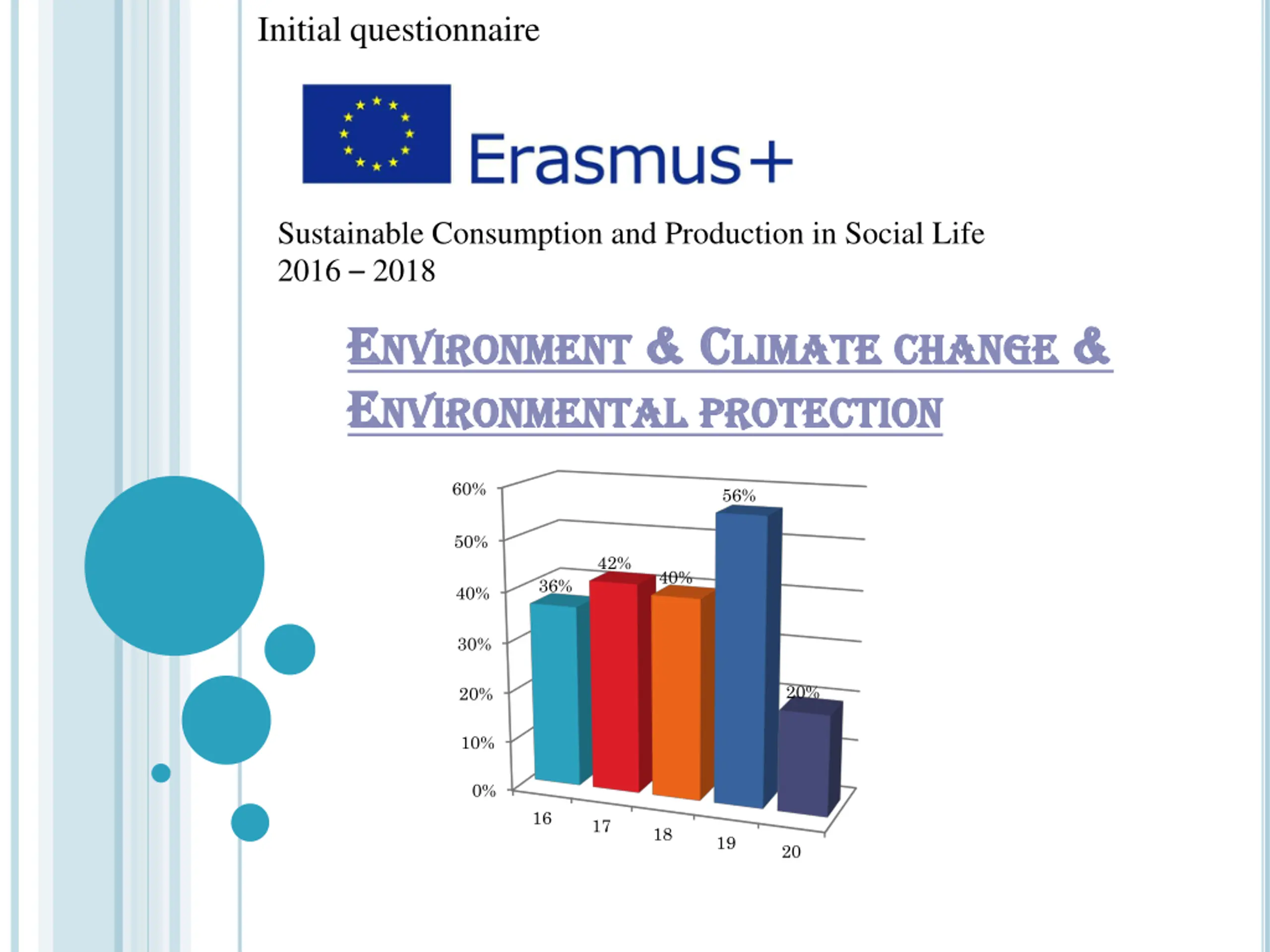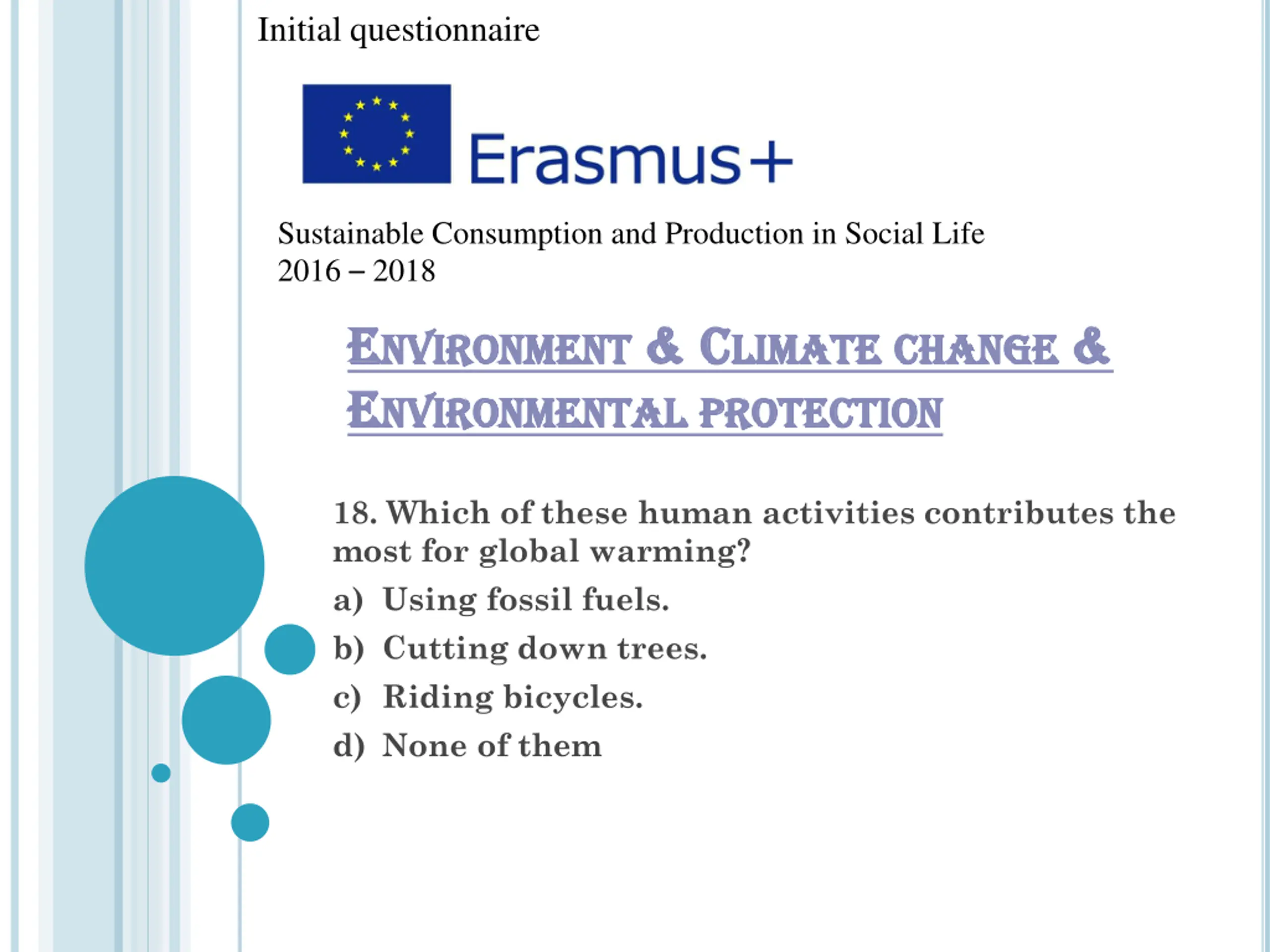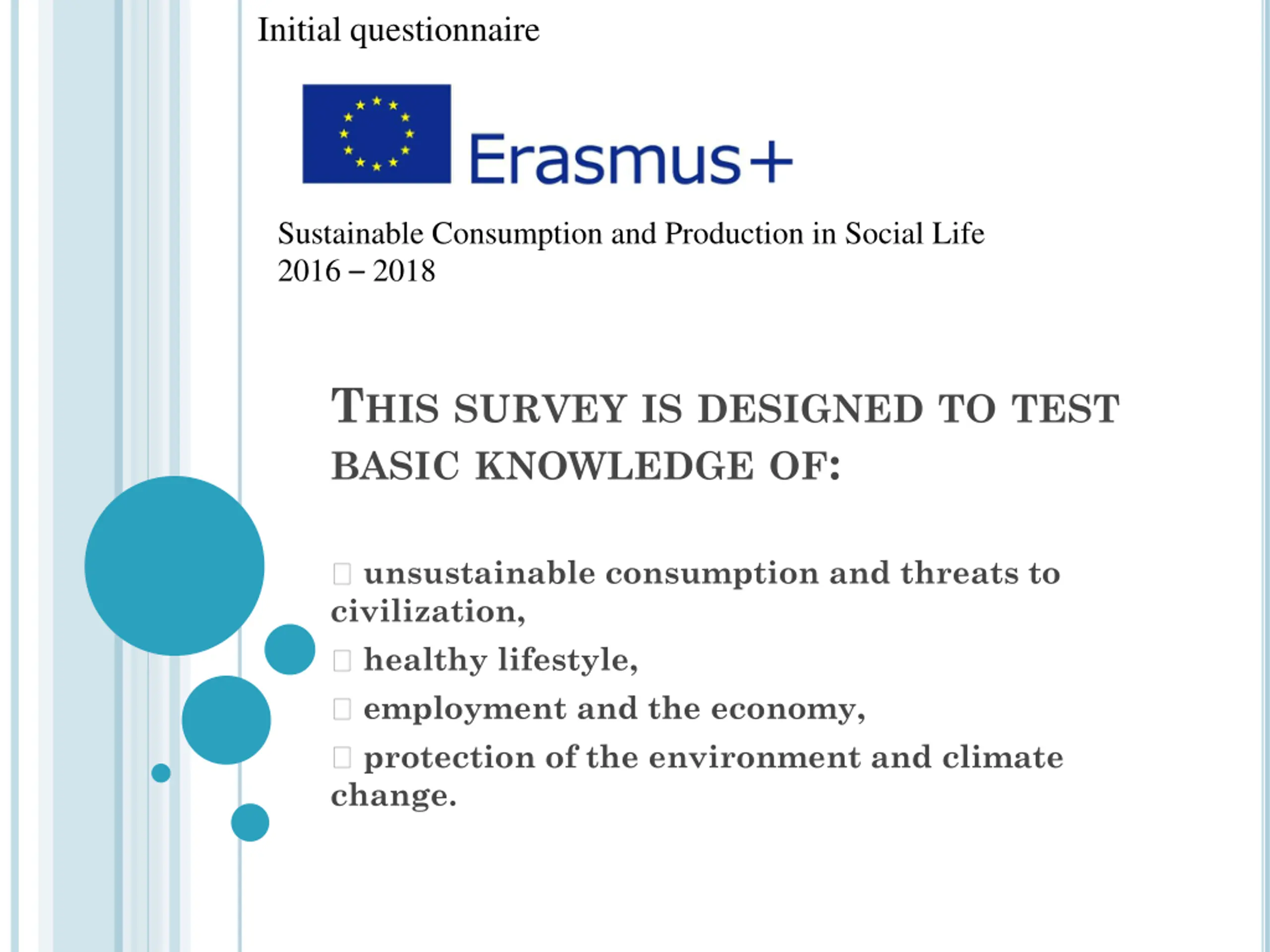 Initial questionnaire Sustainable Consumption and Production in Social Life 2016 2018 THIS SURVEY IS DESIGNED TO TEST BASIC KNOWLEDGE OF: unsustainable consumption and threats to civilization, healthy lifestyle, employment and the economy, protection of the environment and climate change.