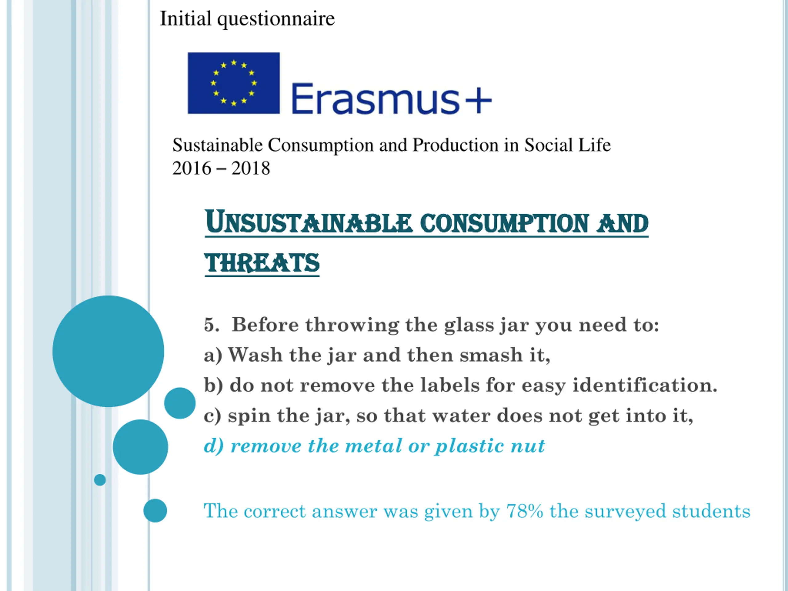 Initial questionnaire Sustainable Consumption and Production in Social Life 2016 2018 U UNSUSTAINABLE NSUSTAINABLE CONSUMPTION THREATS THREATS CONSUMPTION AND AND 5. Before throwing the glass jar you need to: a) Wash the jar and then smash it, b) do not remove the labels for easy identification. c) spin the jar, so that water does not get into it, d) remove the metal or plastic nut The correct answer was given by 78% the surveyed students