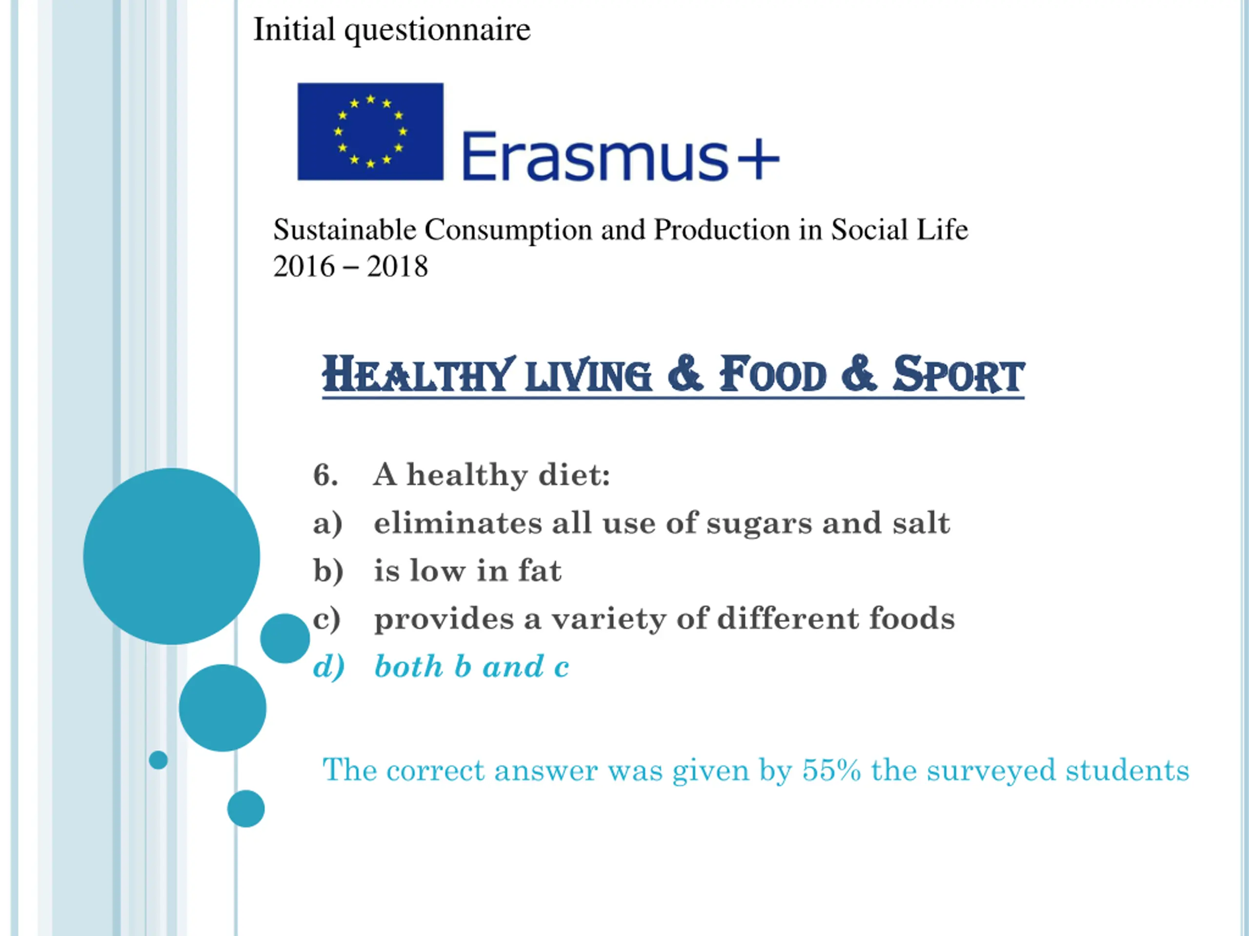 Initial questionnaire Sustainable Consumption and Production in Social Life 2016 2018 H HEALTHY EALTHY LIVING LIVING & F & FOOD OOD & S & SPORT PORT 6. A healthy diet: a) eliminates all use of sugars and salt b) is low in fat c) provides a variety of different foods d) both b and c The correct answer was given by 55% the surveyed students