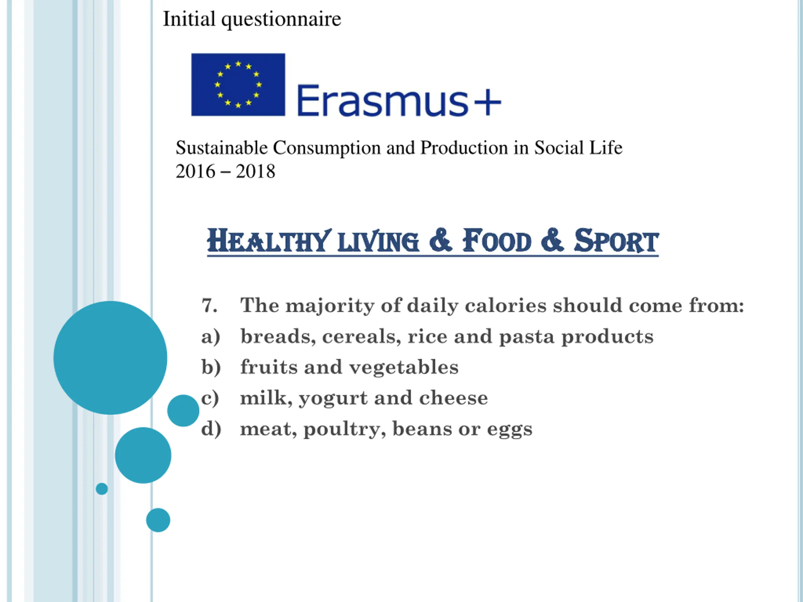 Initial questionnaire Sustainable Consumption and Production in Social Life 2016 2018 H HEALTHY EALTHY LIVING LIVING & F & FOOD OOD & S & SPORT PORT 7. The majority of daily calories should come from: a) breads, cereals, rice and pasta products b) fruits and vegetables c) milk, yogurt and cheese d) meat, poultry, beans or eggs