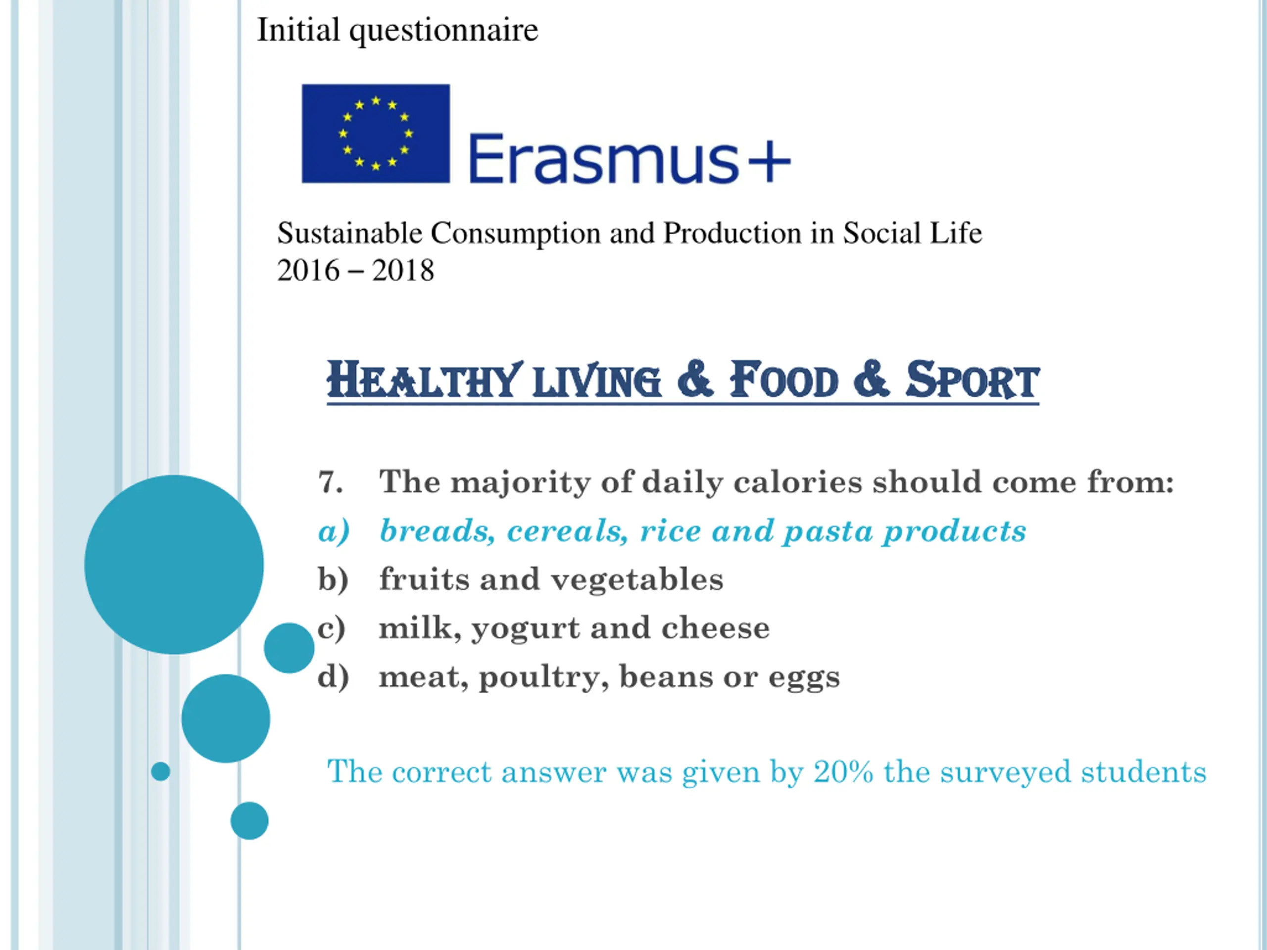 Initial questionnaire Sustainable Consumption and Production in Social Life 2016 2018 H HEALTHY EALTHY LIVING LIVING & F & FOOD OOD & S & SPORT PORT 7. The majority of daily calories should come from: a) breads, cereals, rice and pasta products b) fruits and vegetables c) milk, yogurt and cheese d) meat, poultry, beans or eggs The correct answer was given by 20% the surveyed students