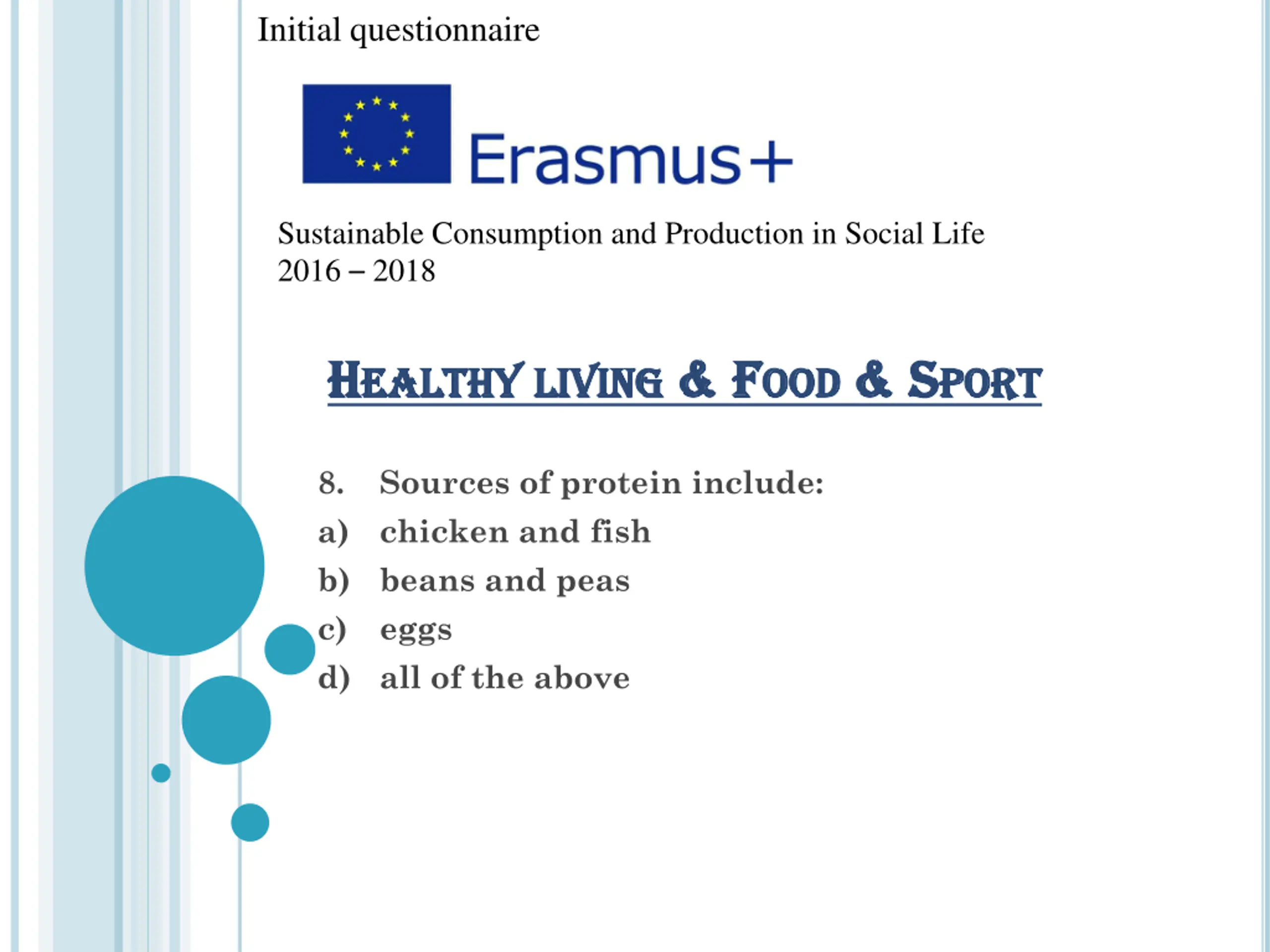 Initial questionnaire Sustainable Consumption and Production in Social Life 2016 2018 H HEALTHY EALTHY LIVING LIVING & F & FOOD OOD & S & SPORT PORT 8. Sources of protein include: a) chicken and fish b) beans and peas c) eggs d) all of the above