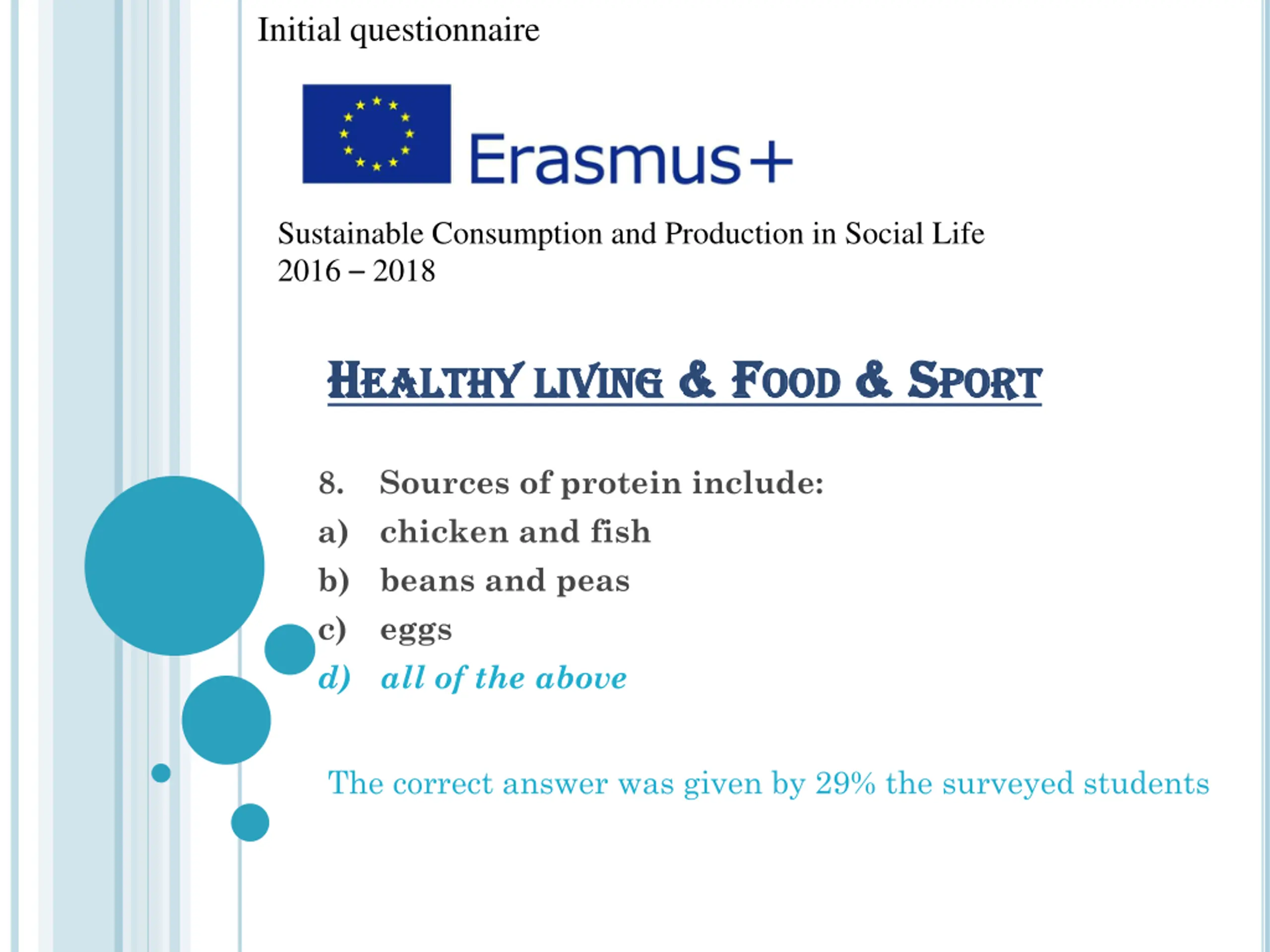 Initial questionnaire Sustainable Consumption and Production in Social Life 2016 2018 H HEALTHY EALTHY LIVING LIVING & F & FOOD OOD & S & SPORT PORT 8. Sources of protein include: a) chicken and fish b) beans and peas c) eggs d) all of the above The correct answer was given by 29% the surveyed students