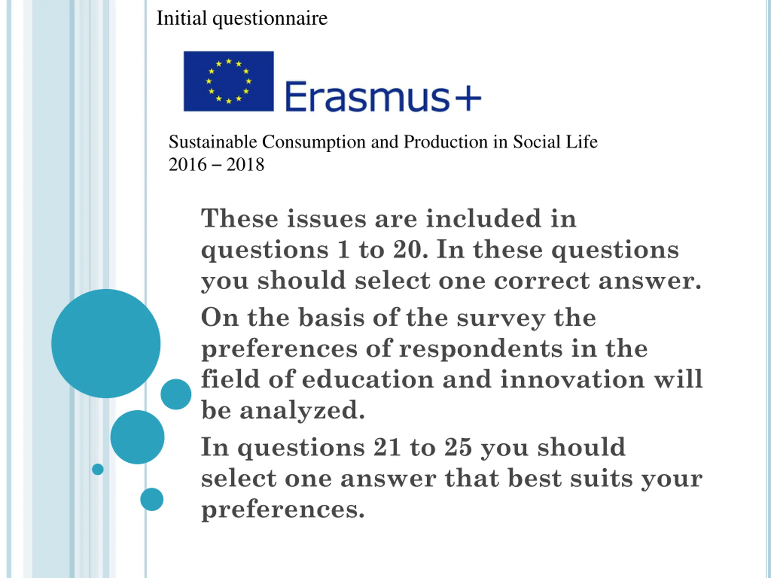 Initial questionnaire Sustainable Consumption and Production in Social Life 2016 2018 These issues are included in questions 1 to 20. In these questions you should select one correct answer. On the basis of the survey the preferences of respondents in the field of education and innovation will be analyzed. In questions 21 to 25 you should select one answer that best suits your preferences.