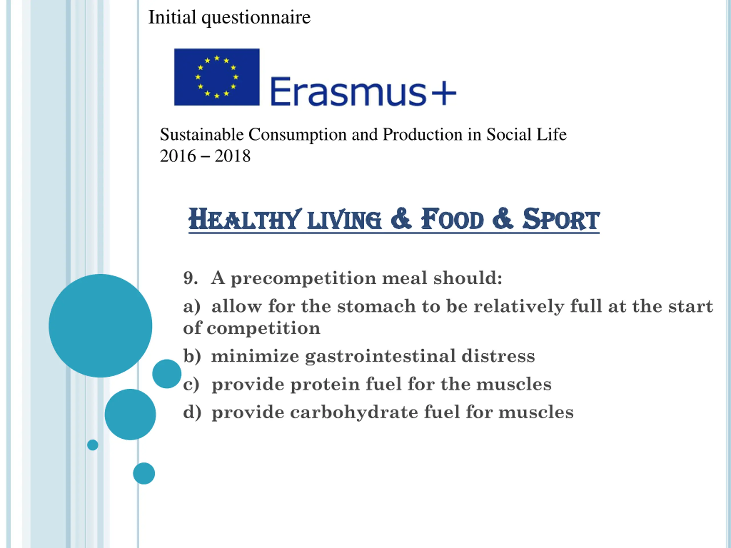 Initial questionnaire Sustainable Consumption and Production in Social Life 2016 2018 H HEALTHY EALTHY LIVING LIVING & F & FOOD OOD & S & SPORT PORT 9. A precompetition meal should: a) allow for the stomach to be relatively full at the start of competition b) minimize gastrointestinal distress c) provide protein fuel for the muscles d) provide carbohydrate fuel for muscles
