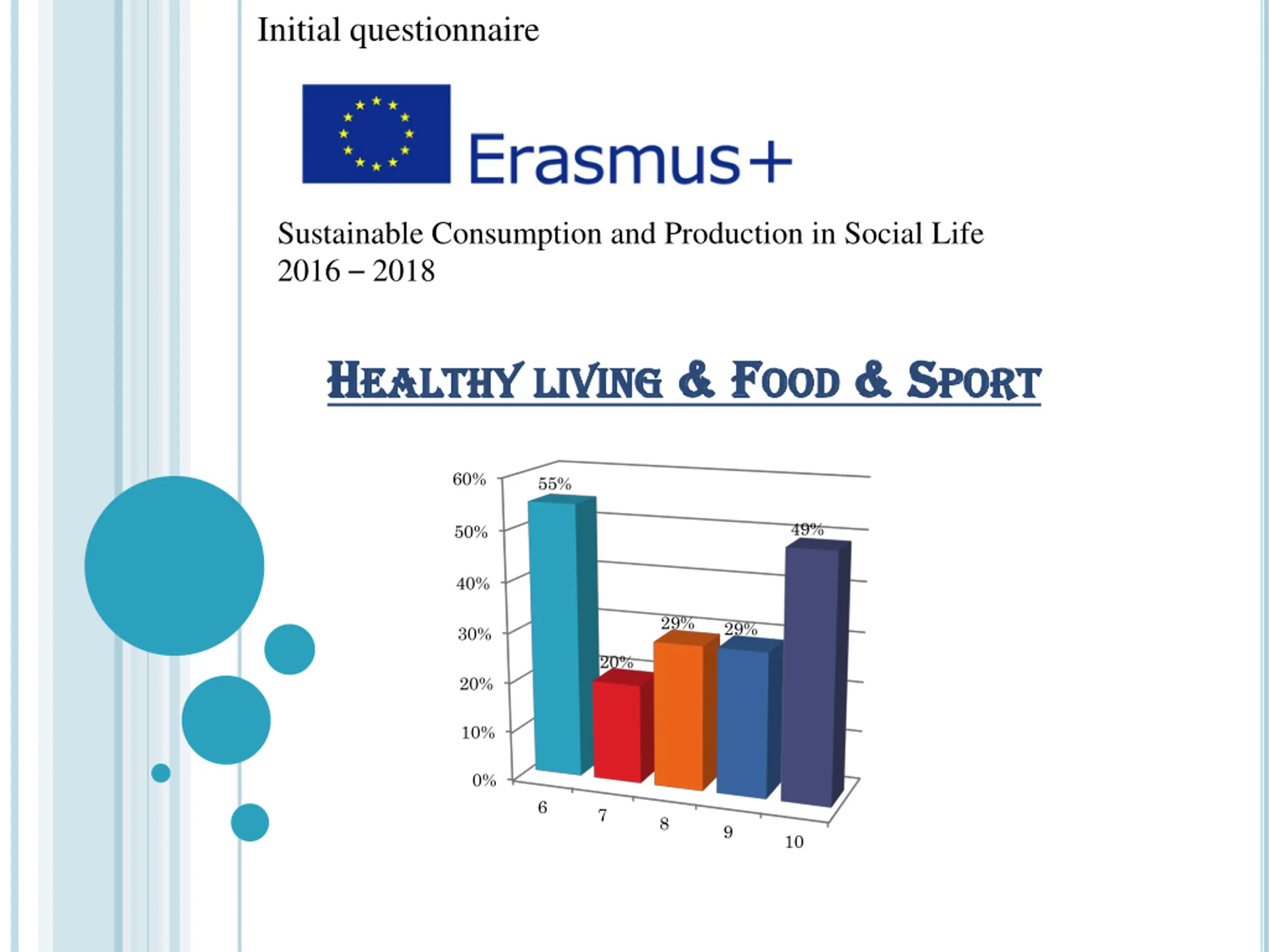 Initial questionnaire Sustainable Consumption and Production in Social Life 2016 2018 H HEALTHY EALTHY LIVING LIVING & F & FOOD OOD & S & SPORT PORT 60% 55% 49% 50% 40% 29% 29% 30% 20% 20% 10% 0% 6 7 8 9 10