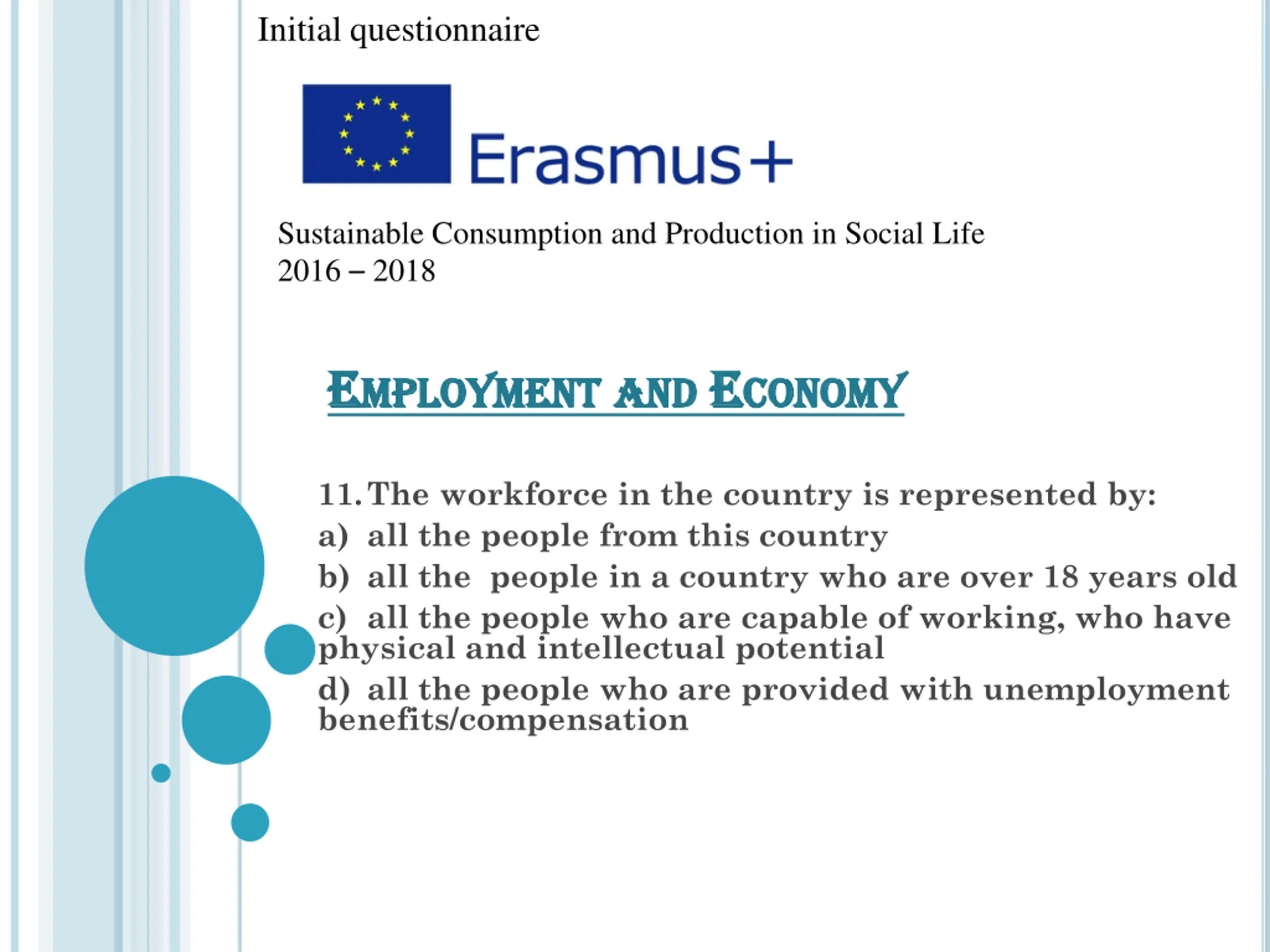Initial questionnaire Sustainable Consumption and Production in Social Life 2016 2018 E EMPLOYMENT MPLOYMENT AND AND E ECONOMY CONOMY 11.The workforce in the country is represented by: a) all the people from this country b) all the people in a country who are over 18 years old c) all the people who are capable of working, who have physical and intellectual potential d) all the people who are provided with unemployment benefits/compensation
