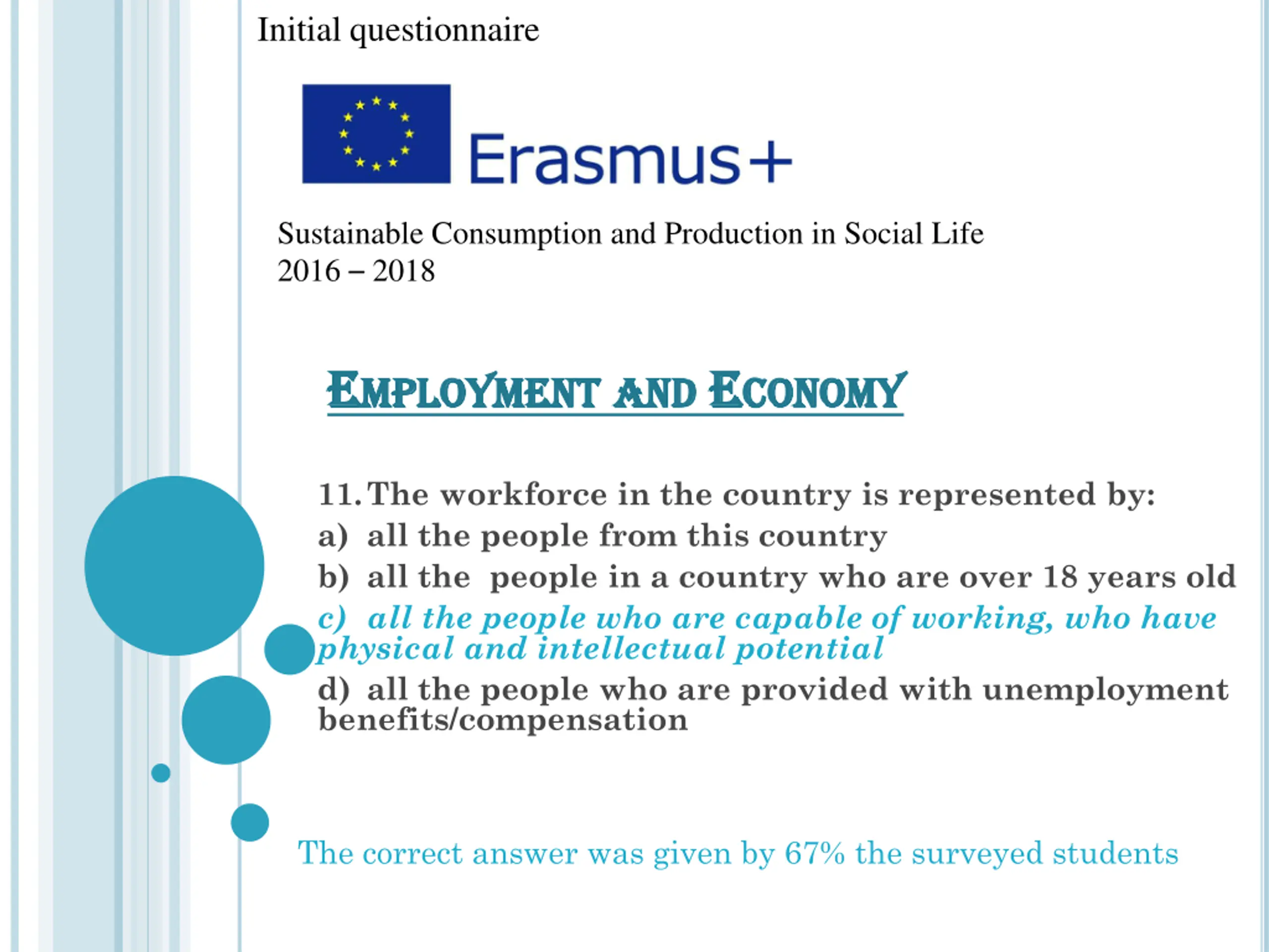 Initial questionnaire Sustainable Consumption and Production in Social Life 2016 2018 E EMPLOYMENT MPLOYMENT AND AND E ECONOMY CONOMY 11.The workforce in the country is represented by: a) all the people from this country b) all the people in a country who are over 18 years old c) all the people who are capable of working, who have physical and intellectual potential d) all the people who are provided with unemployment benefits/compensation The correct answer was given by 67% the surveyed students