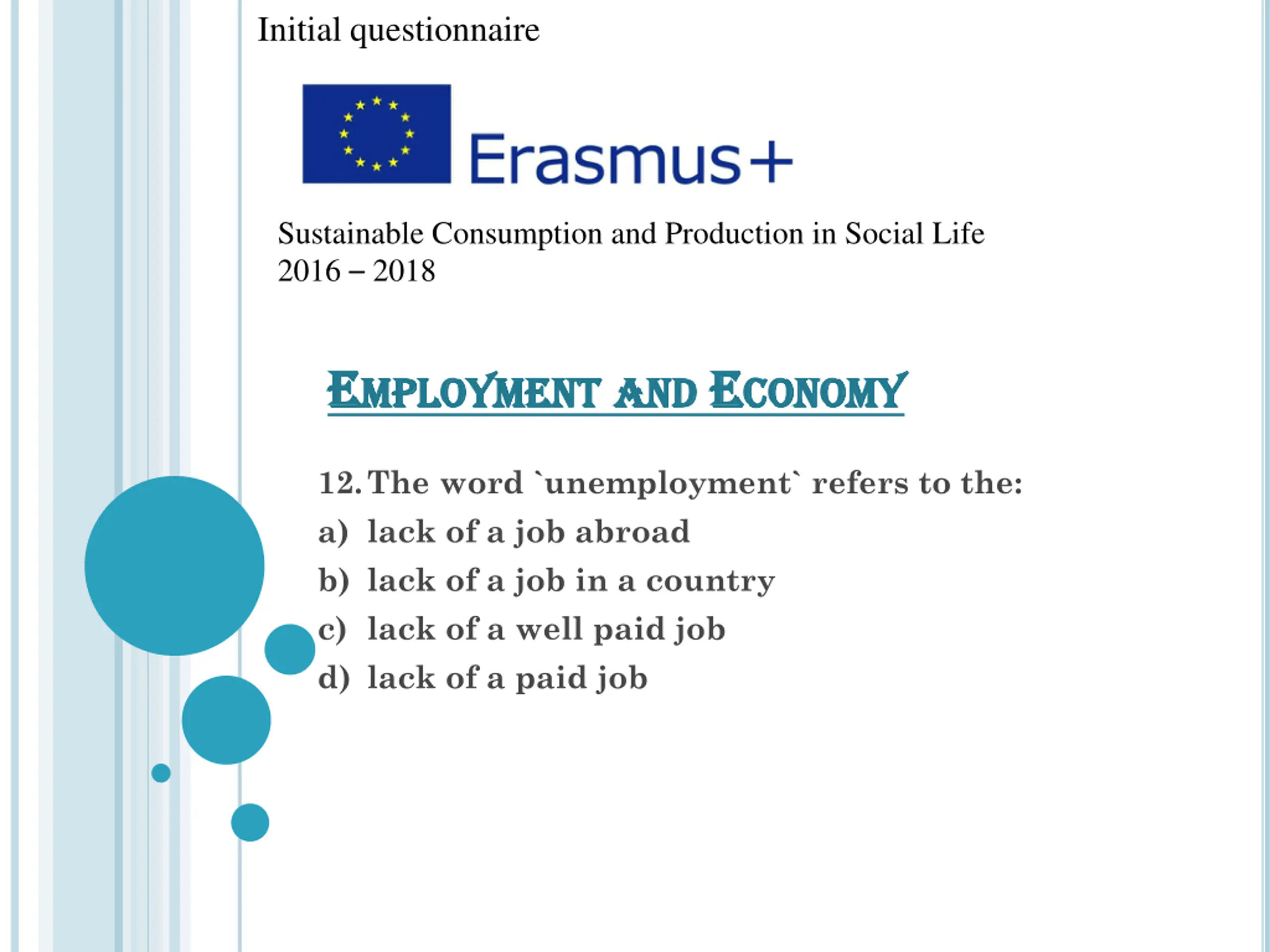 Initial questionnaire Sustainable Consumption and Production in Social Life 2016 2018 E EMPLOYMENT MPLOYMENT AND AND E ECONOMY CONOMY 12.The word `unemployment` refers to the: a) lack of a job abroad b) lack of a job in a country c) lack of a well paid job d) lack of a paid job