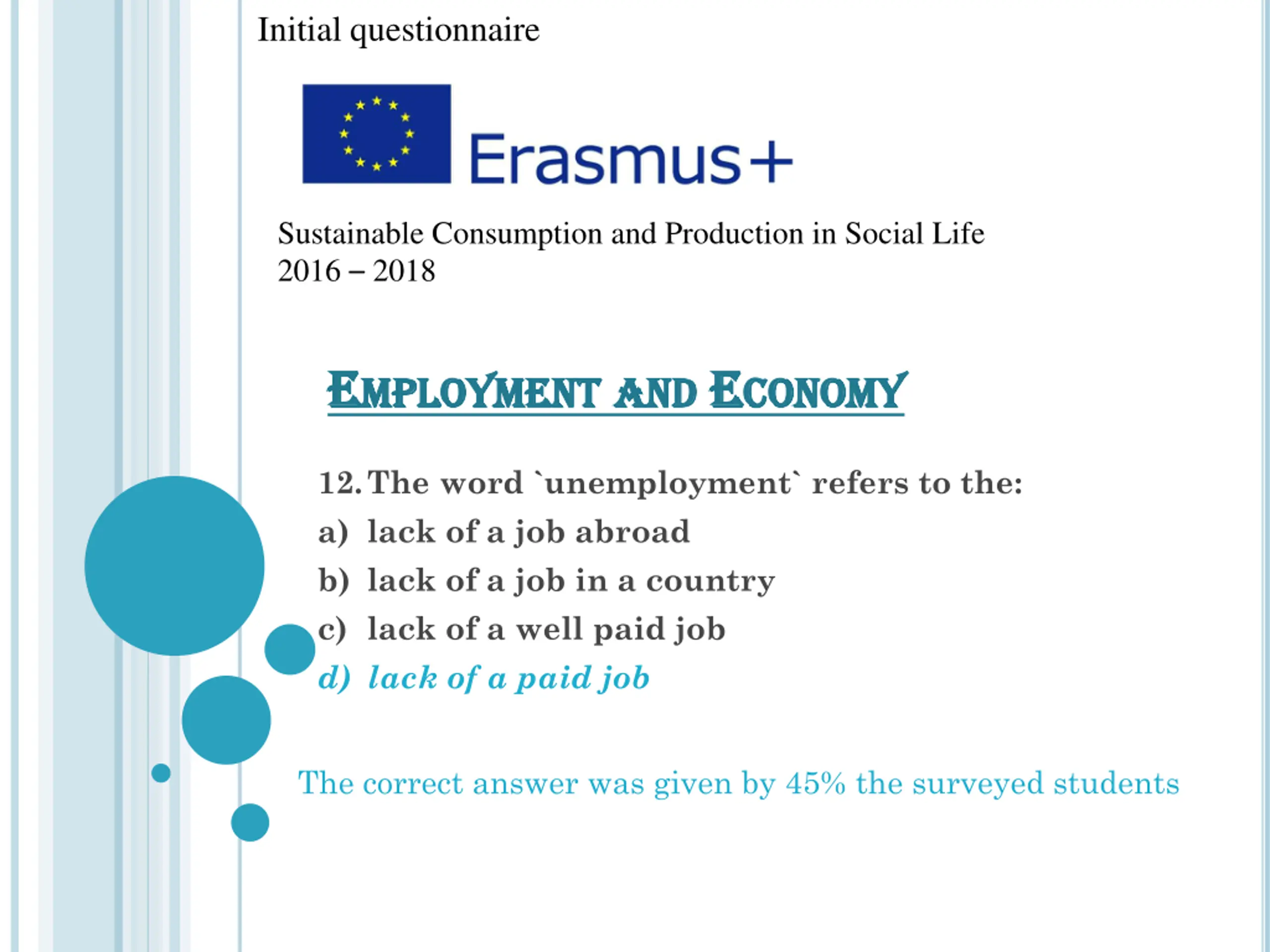 Initial questionnaire Sustainable Consumption and Production in Social Life 2016 2018 E EMPLOYMENT MPLOYMENT AND AND E ECONOMY CONOMY 12.The word `unemployment` refers to the: a) lack of a job abroad b) lack of a job in a country c) lack of a well paid job d) lack of a paid job The correct answer was given by 45% the surveyed students