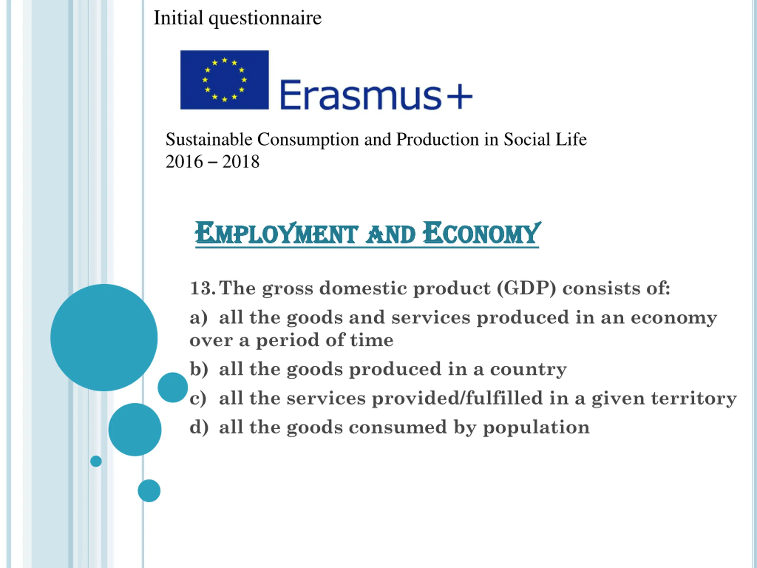Initial questionnaire Sustainable Consumption and Production in Social Life 2016 2018 E EMPLOYMENT MPLOYMENT AND AND E ECONOMY CONOMY 13.The gross domestic product (GDP) consists of: a) all the goods and services produced in an economy over a period of time b) all the goods produced in a country c) all the services provided/fulfilled in a given territory d) all the goods consumed by population