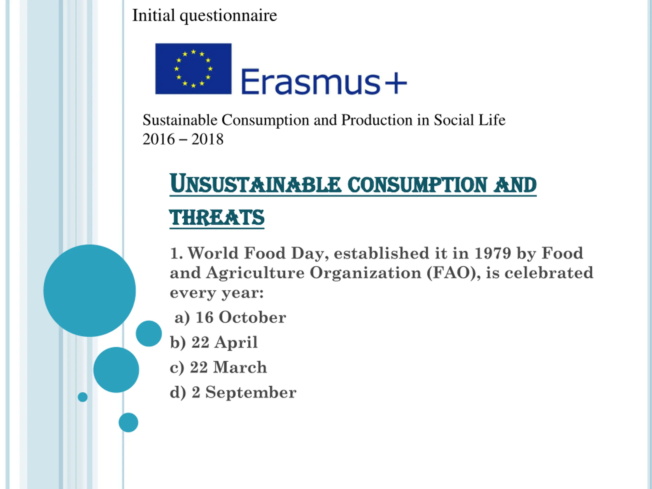 Initial questionnaire Sustainable Consumption and Production in Social Life 2016 2018 U UNSUSTAINABLE NSUSTAINABLE CONSUMPTION THREATS THREATS CONSUMPTION AND AND 1. World Food Day, established it in 1979 by Food and Agriculture Organization (FAO), is celebrated every year: a) 16 October b) 22 April c) 22 March d) 2 September