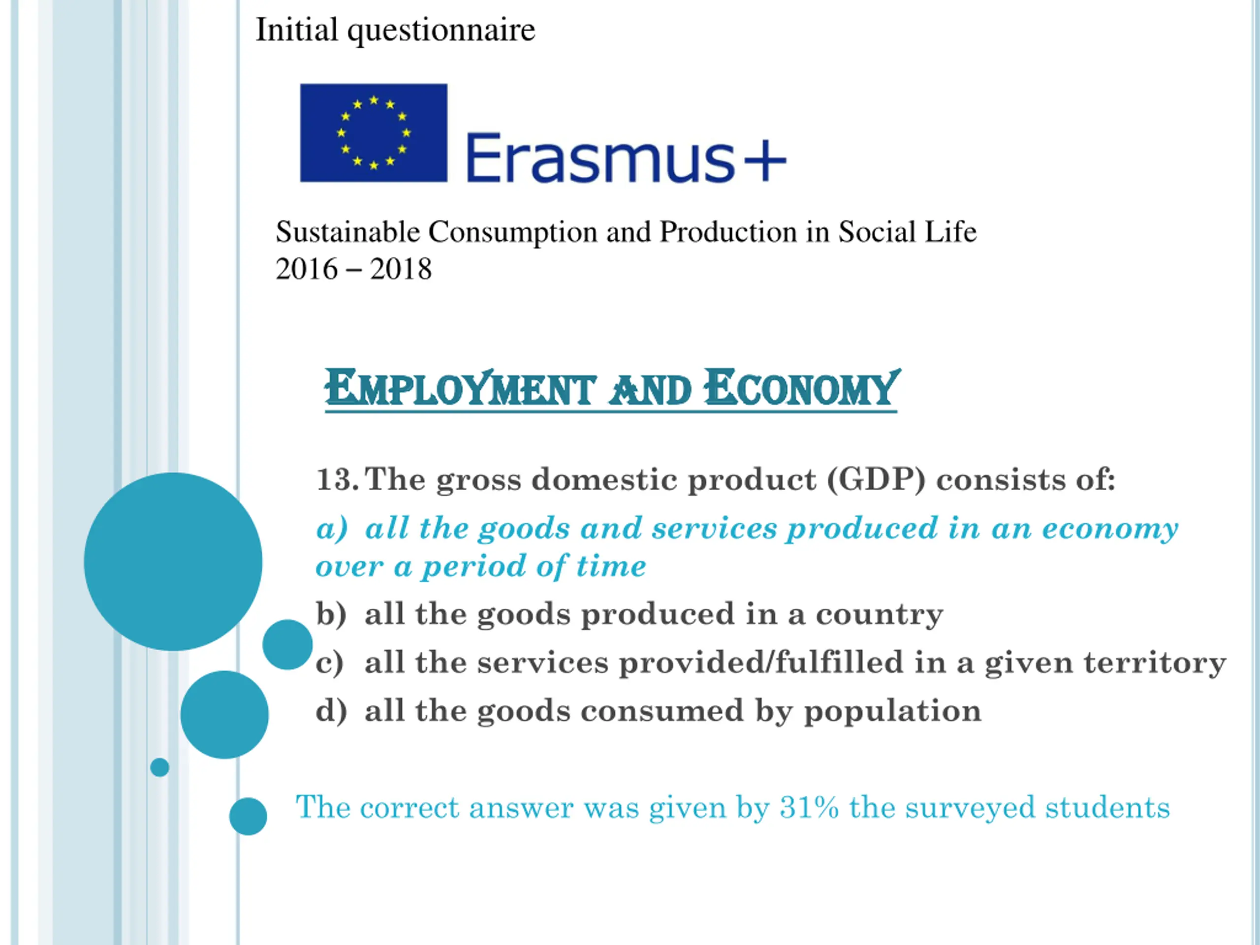Initial questionnaire Sustainable Consumption and Production in Social Life 2016 2018 E EMPLOYMENT MPLOYMENT AND AND E ECONOMY CONOMY 13.The gross domestic product (GDP) consists of: a) all the goods and services produced in an economy over a period of time b) all the goods produced in a country c) all the services provided/fulfilled in a given territory d) all the goods consumed by population The correct answer was given by 31% the surveyed students