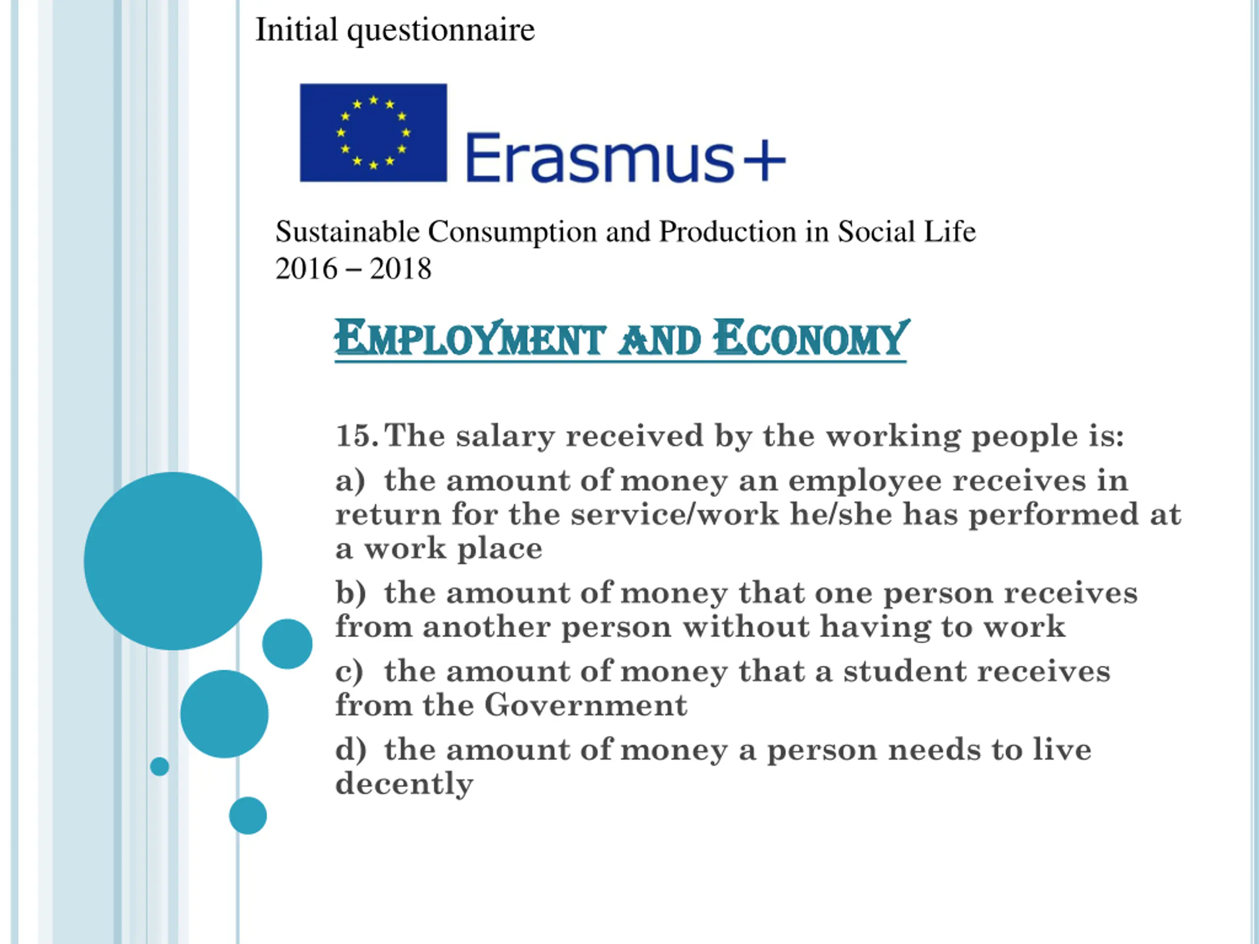 Initial questionnaire Sustainable Consumption and Production in Social Life 2016 2018 E EMPLOYMENT MPLOYMENT AND AND E ECONOMY CONOMY 15.The salary received by the working people is: a) the amount of money an employee receives in return for the service/work he/she has performed at a work place b) the amount of money that one person receives from another person without having to work c) the amount of money that a student receives from the Government d) the amount of money a person needs to live decently