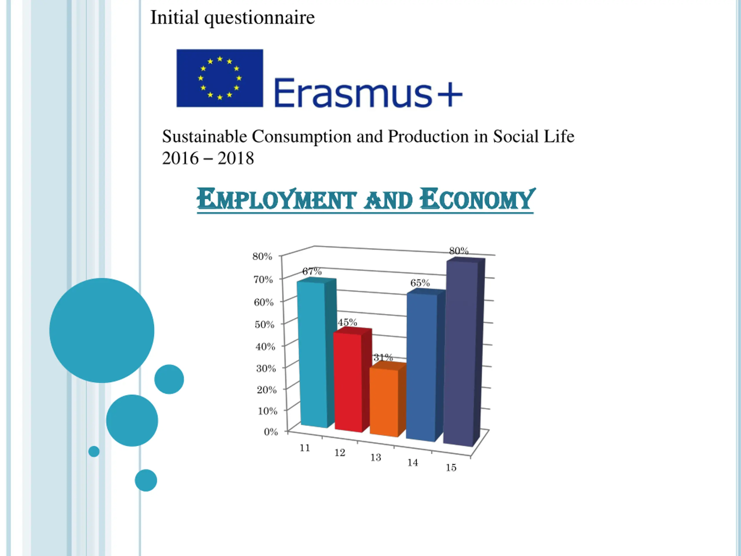 Initial questionnaire Sustainable Consumption and Production in Social Life 2016 2018 E EMPLOYMENT MPLOYMENT AND AND E ECONOMY CONOMY 80% 80% 67% 70% 65% 60% 45% 50% 40% 31% 30% 20% 10% 0% 11 12 13 14 15