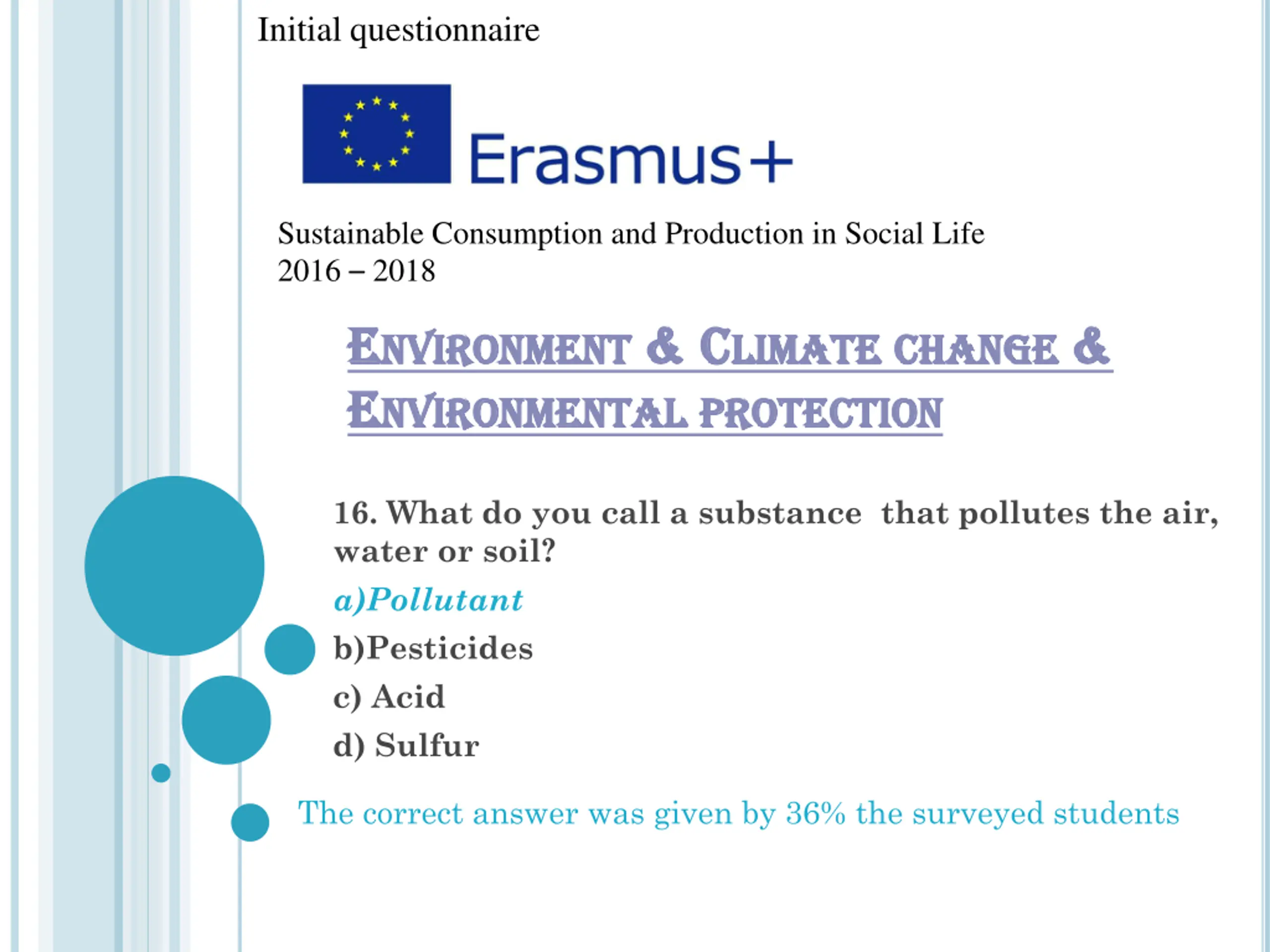 Initial questionnaire Sustainable Consumption and Production in Social Life 2016 2018 E ENVIRONMENT NVIRONMENT & C E ENVIRONMENTAL NVIRONMENTAL PROTECTION & CLIMATE LIMATE CHANGE PROTECTION CHANGE & & 16. What do you call a substance that pollutes the air, water or soil? a)Pollutant b)Pesticides c) Acid d) Sulfur The correct answer was given by 36% the surveyed students