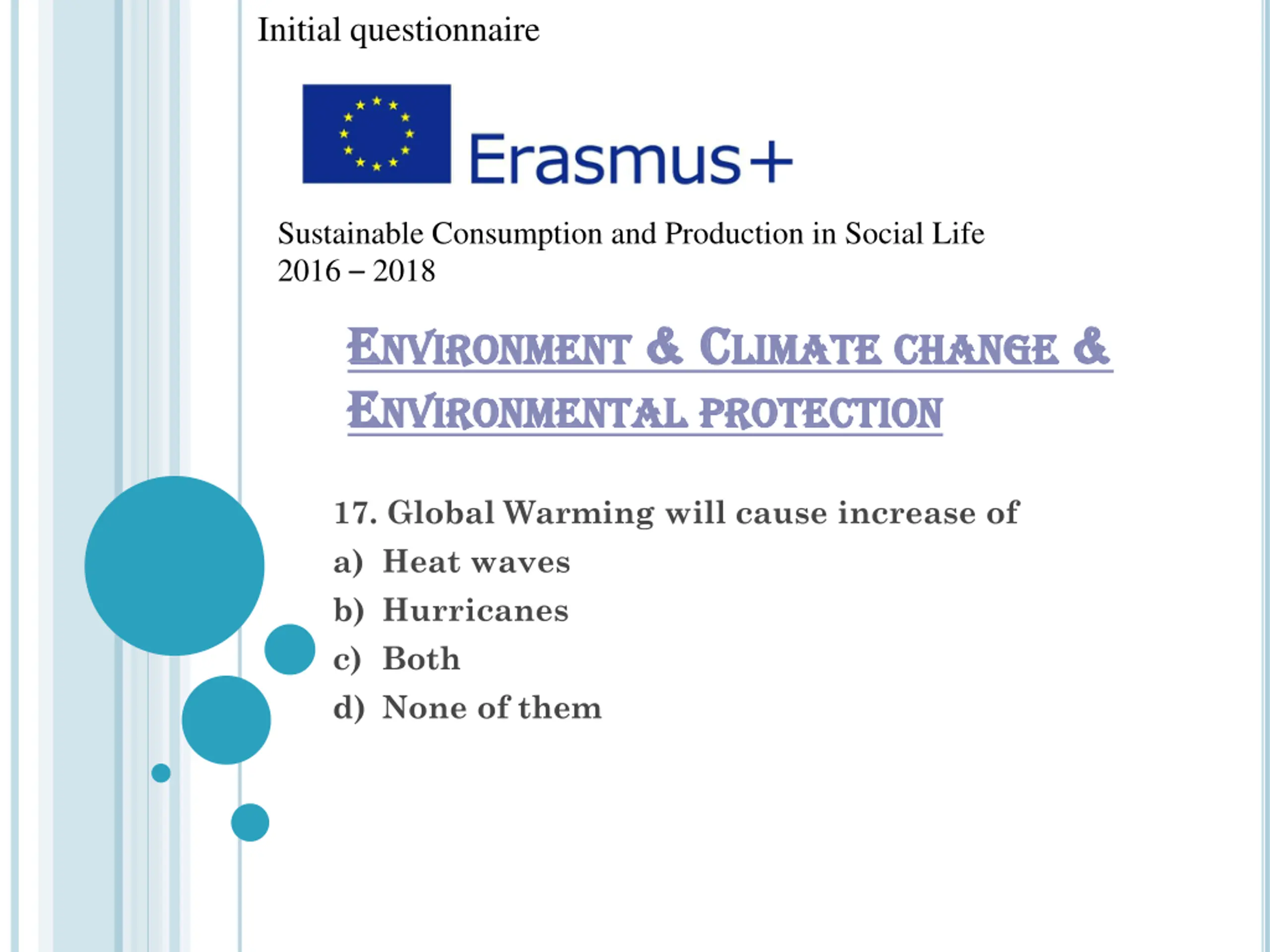 Initial questionnaire Sustainable Consumption and Production in Social Life 2016 2018 E ENVIRONMENT NVIRONMENT & C E ENVIRONMENTAL NVIRONMENTAL PROTECTION & CLIMATE LIMATE CHANGE PROTECTION CHANGE & & 17. Global Warming will cause increase of a) Heat waves b) Hurricanes c) Both d) None of them