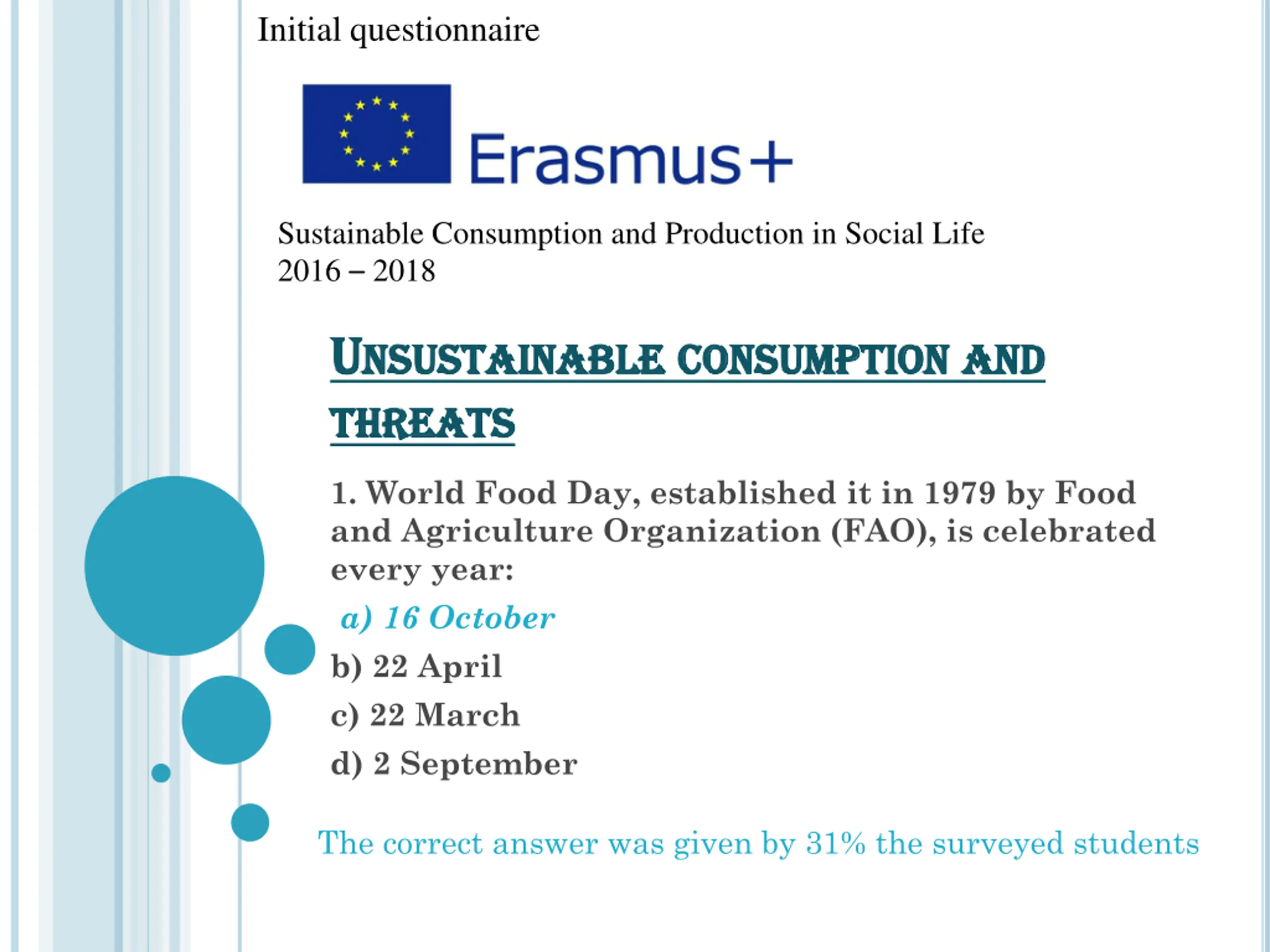 Initial questionnaire Sustainable Consumption and Production in Social Life 2016 2018 U UNSUSTAINABLE NSUSTAINABLE CONSUMPTION THREATS THREATS CONSUMPTION AND AND 1. World Food Day, established it in 1979 by Food and Agriculture Organization (FAO), is celebrated every year: a) 16 October b) 22 April c) 22 March d) 2 September The correct answer was given by 31% the surveyed students