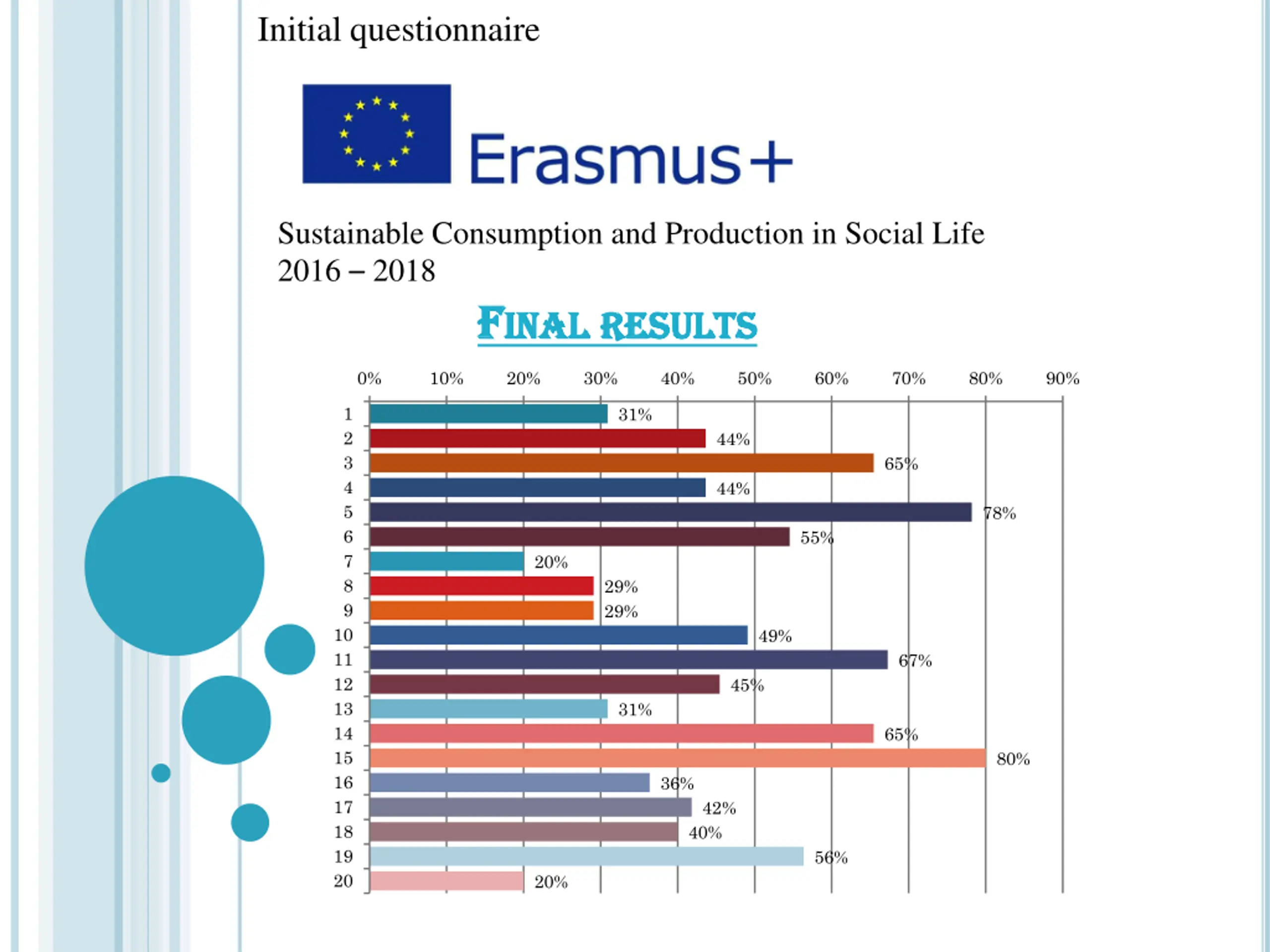 Initial questionnaire Sustainable Consumption and Production in Social Life 2016 2018 F FINAL INALRESULTS RESULTS 0% 10% 20% 30% 40% 50% 60% 70% 80% 90% 1 2 3 4 5 6 7 8 9 31% 44% 65% 44% 78% 55% 20% 29% 29% 10 11 12 13 14 15 16 17 18 19 20 49% 67% 45% 31% 65% 80% 36% 42% 40% 56% 20%