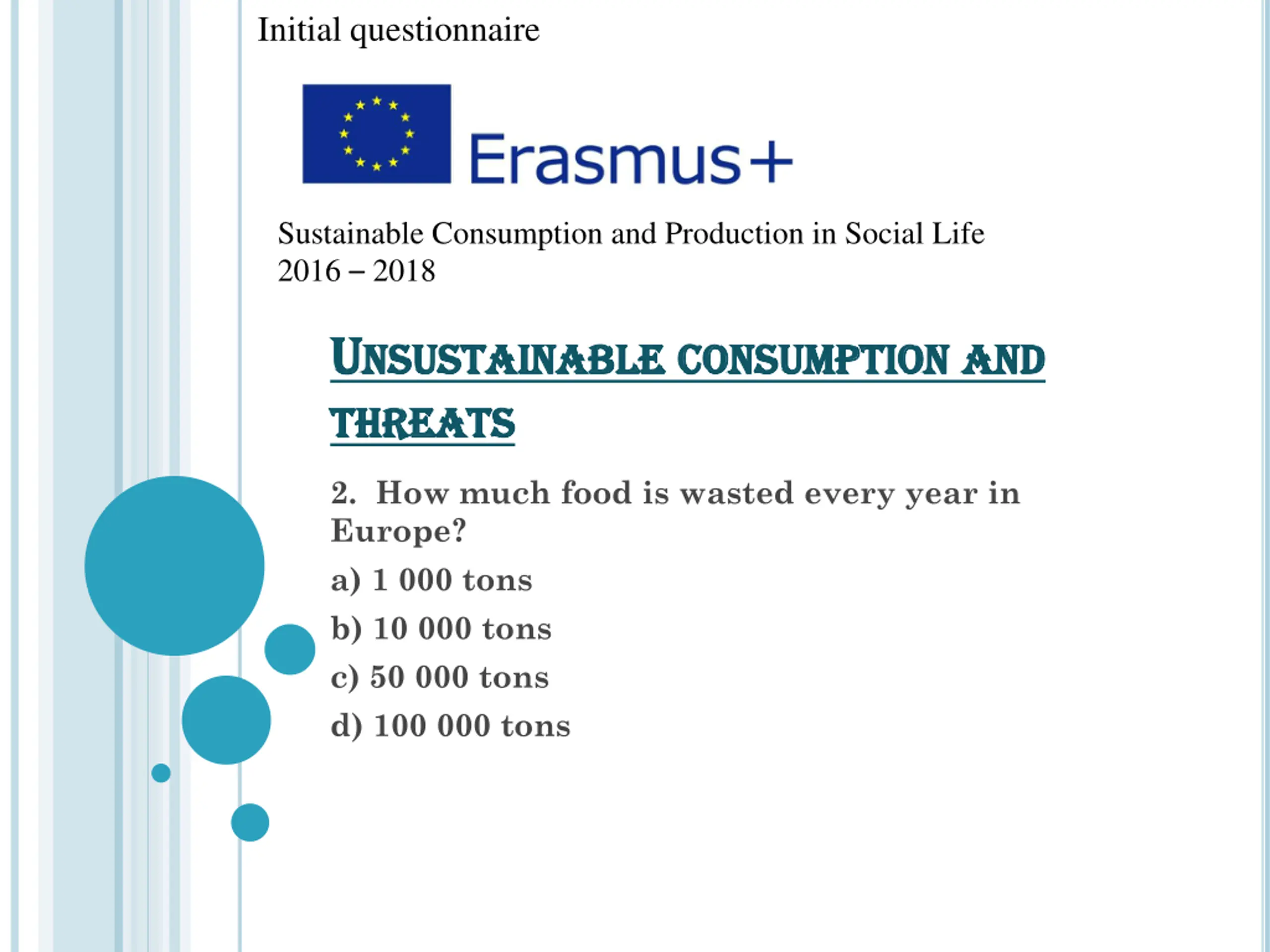 Initial questionnaire Sustainable Consumption and Production in Social Life 2016 2018 U UNSUSTAINABLE NSUSTAINABLE CONSUMPTION THREATS THREATS CONSUMPTION AND AND 2. How much food is wasted every year in Europe? a) 1 000 tons b) 10 000 tons c) 50 000 tons d) 100 000 tons