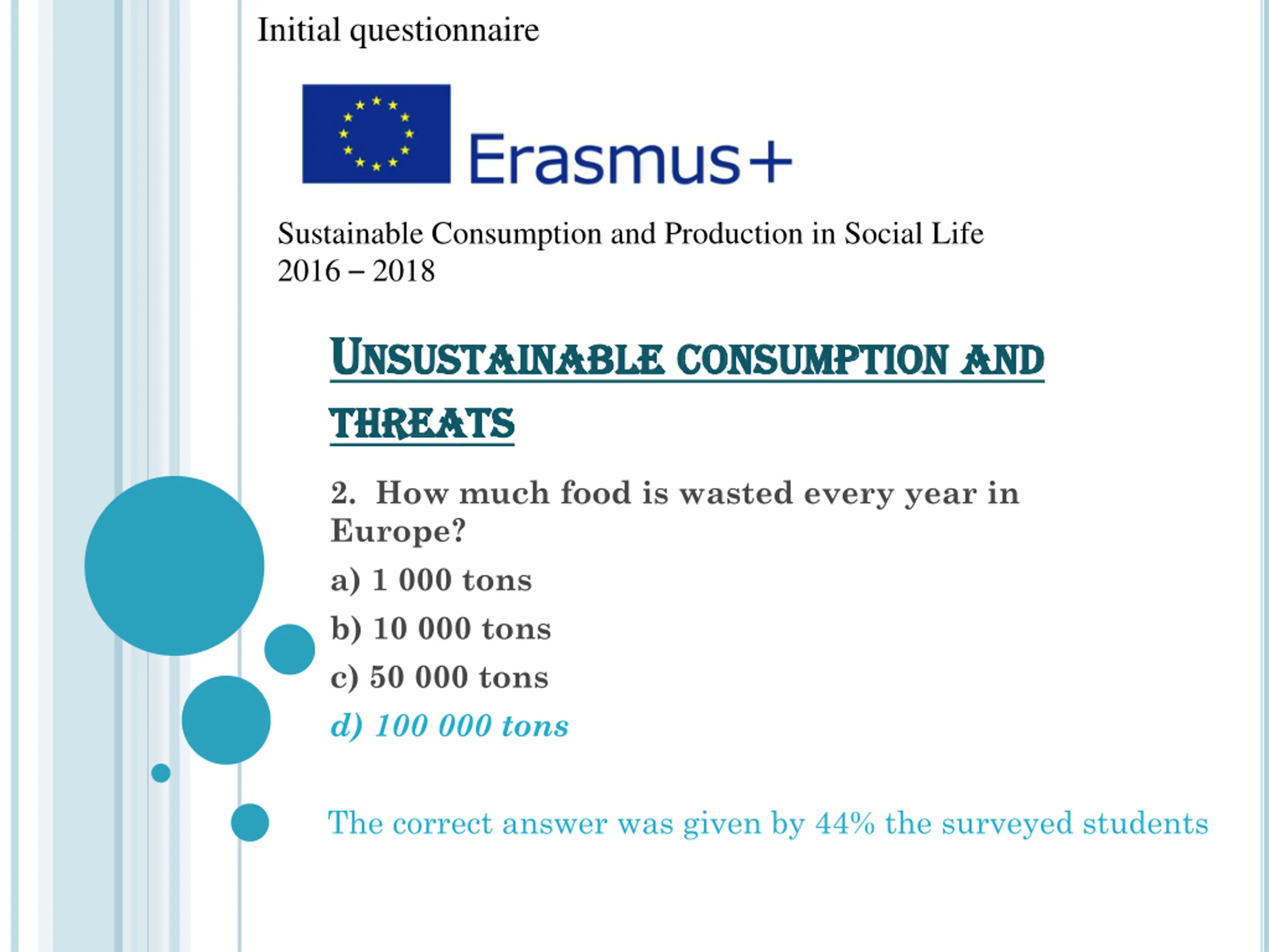 Initial questionnaire Sustainable Consumption and Production in Social Life 2016 2018 U UNSUSTAINABLE NSUSTAINABLE CONSUMPTION THREATS THREATS CONSUMPTION AND AND 2. How much food is wasted every year in Europe? a) 1 000 tons b) 10 000 tons c) 50 000 tons d) 100 000 tons The correct answer was given by 44% the surveyed students