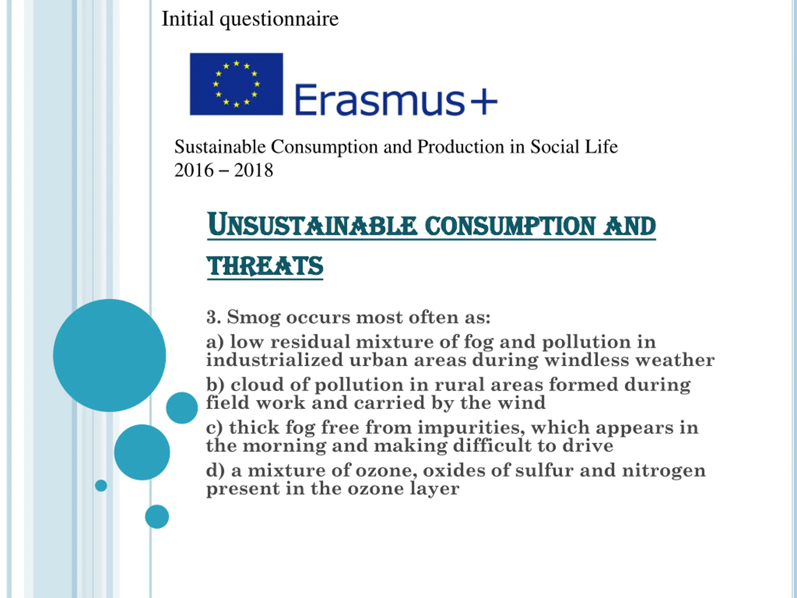 Initial questionnaire Sustainable Consumption and Production in Social Life 2016 2018 U UNSUSTAINABLE NSUSTAINABLE CONSUMPTION THREATS THREATS CONSUMPTION AND AND 3. Smog occurs most often as: a) low residual mixture of fog and pollution in industrialized urban areas during windless weather b) cloud of pollution in rural areas formed during field work and carried by the wind c) thick fog free from impurities, which appears in the morning and making difficult to drive d) a mixture of ozone, oxides of sulfur and nitrogen present in the ozone layer