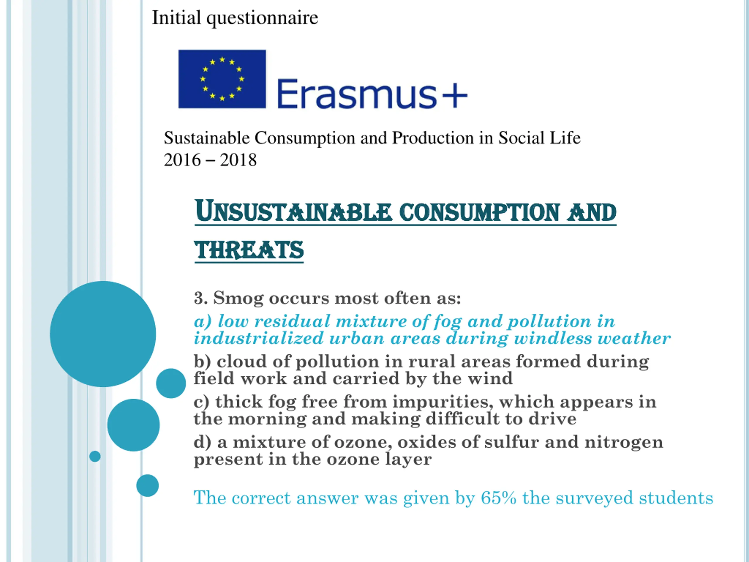 Initial questionnaire Sustainable Consumption and Production in Social Life 2016 2018 U UNSUSTAINABLE NSUSTAINABLE CONSUMPTION THREATS THREATS CONSUMPTION AND AND 3. Smog occurs most often as: a) low residual mixture of fog and pollution in industrialized urban areas during windless weather b) cloud of pollution in rural areas formed during field work and carried by the wind c) thick fog free from impurities, which appears in the morning and making difficult to drive d) a mixture of ozone, oxides of sulfur and nitrogen present in the ozone layer The correct answer was given by 65% the surveyed students