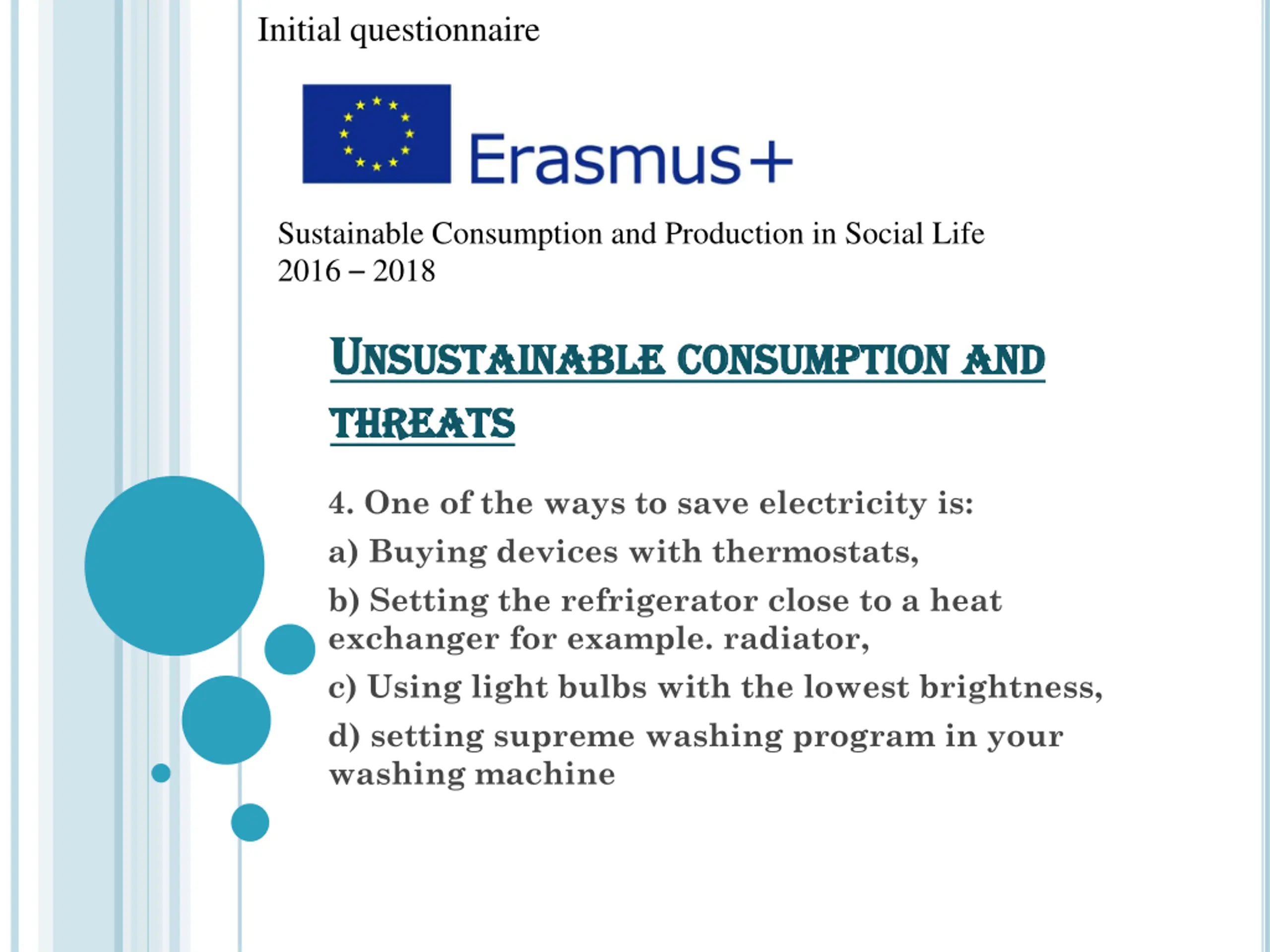 Initial questionnaire Sustainable Consumption and Production in Social Life 2016 2018 U UNSUSTAINABLE NSUSTAINABLE CONSUMPTION THREATS THREATS CONSUMPTION AND AND 4. One of the ways to save electricity is: a) Buying devices with thermostats, b) Setting the refrigerator close to a heat exchanger for example. radiator, c) Using light bulbs with the lowest brightness, d) setting supreme washing program in your washing machine