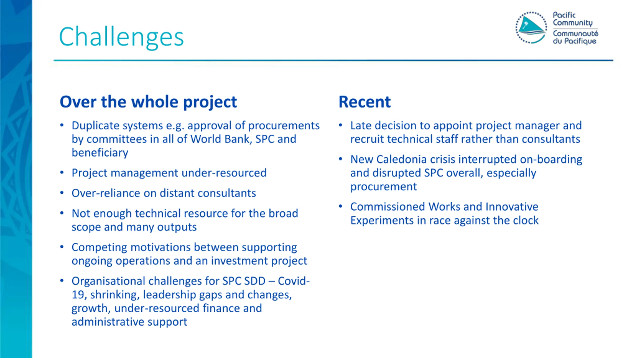 Challenges Over the whole project Duplicate systems e.g. approval of procurements by committees in all of World Bank, SPC and beneficiary Project management under-resourced Over-reliance on distant consultants Not enough technical resource for the broad scope and many outputs Competing motivations between supporting ongoing operations and an investment project Organisational challenges for SPC SDD Covid- 19, shrinking, leadership gaps and changes, growth, under-resourced finance and administrative support Recent Late decision to appoint project manager and recruit technical staff rather than consultants New Caledonia crisis interrupted on-boarding and disrupted SPC overall, especially procurement Commissioned Works and Innovative Experiments in race against the clock