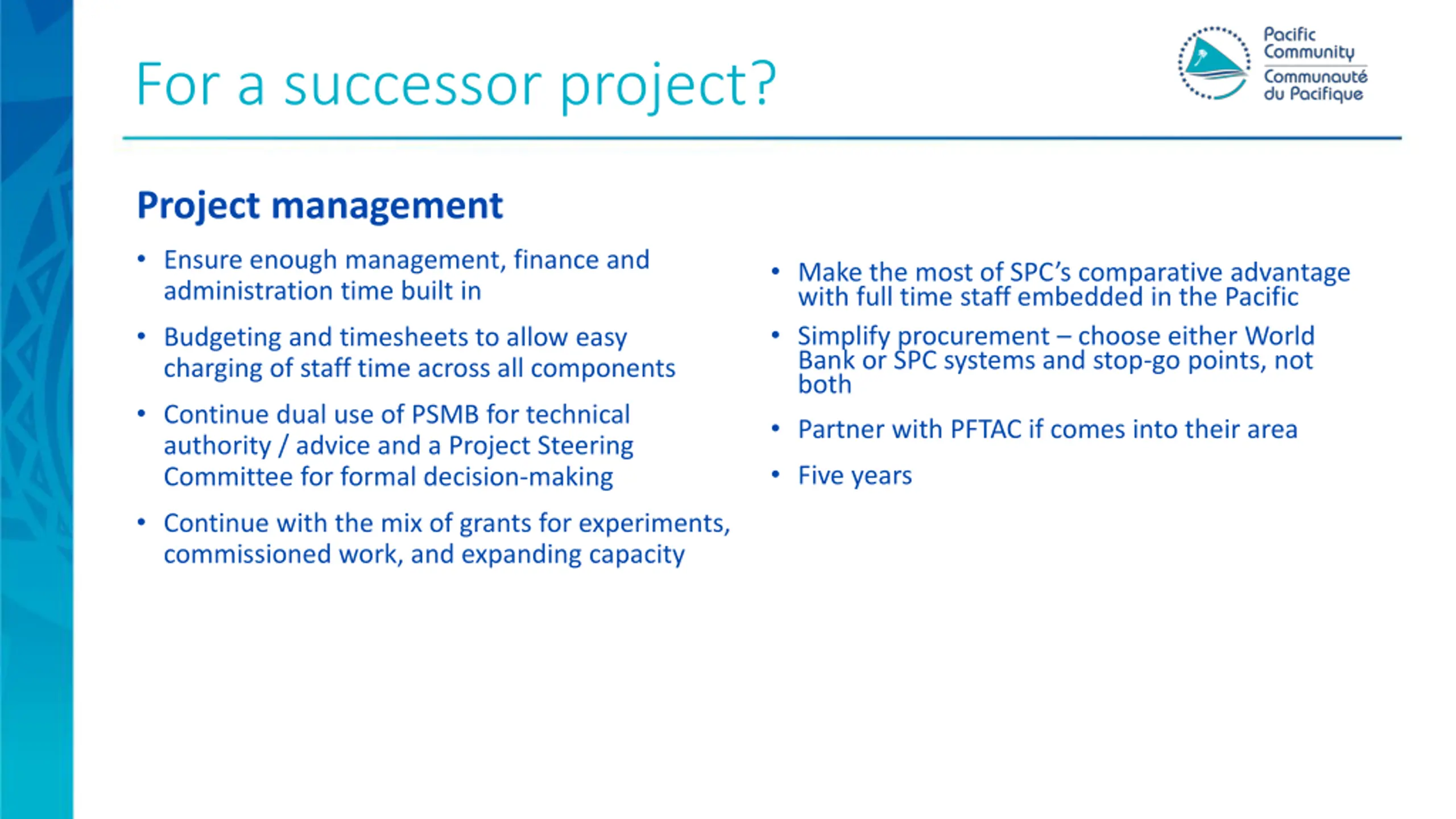 For a successor project? Project management Ensure enough management, finance and administration time built in Budgeting and timesheets to allow easy charging of staff time across all components Continue dual use of PSMB for technical authority / advice and a Project Steering Committee for formal decision-making Continue with the mix of grants for experiments, commissioned work, and expanding capacity Make the most of SPC s comparative advantage with full time staff embedded in the Pacific Simplify procurement choose either World Bank or SPC systems and stop-go points, not both Partner with PFTAC if comes into their area Five years