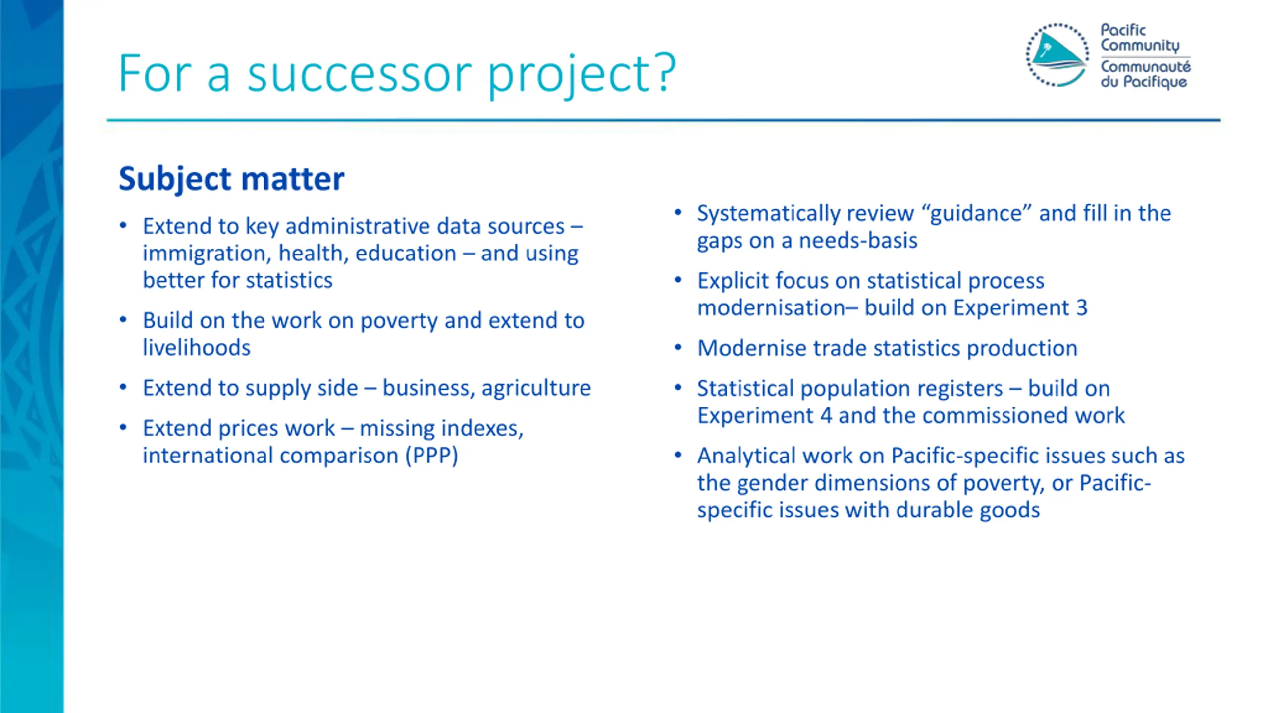 For a successor project? Subject matter Extend to key administrative data sources immigration, health, education and using better for statistics Build on the work on poverty and extend to livelihoods Extend to supply side business, agriculture Extend prices work missing indexes, international comparison (PPP) Systematically review guidance and fill in the gaps on a needs-basis Explicit focus on statistical process modernisation build on Experiment 3 Modernise trade statistics production Statistical population registers build on Experiment 4 and the commissioned work Analytical work on Pacific-specific issues such as the gender dimensions of poverty, or Pacific- specific issues with durable goods