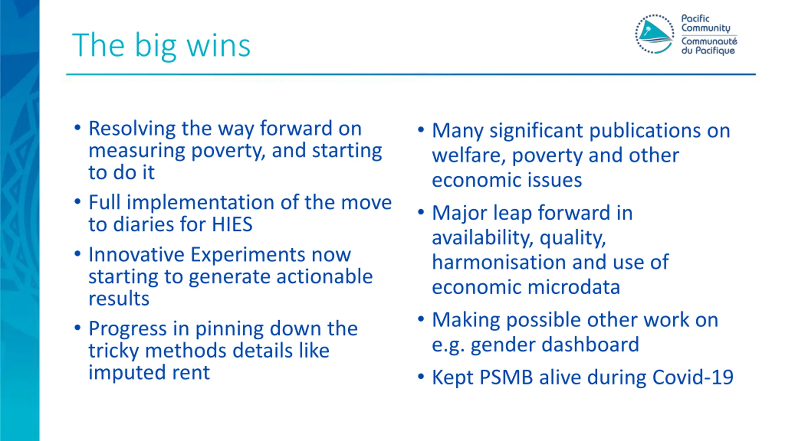 The big wins Resolving the way forward on measuring poverty, and starting to do it Full implementation of the move to diaries for HIES Innovative Experiments now starting to generate actionable results Progress in pinning down the tricky methods details like imputed rent Many significant publications on welfare, poverty and other economic issues Major leap forward in availability, quality, harmonisation and use of economic microdata Making possible other work on e.g. gender dashboard Kept PSMB alive during Covid-19