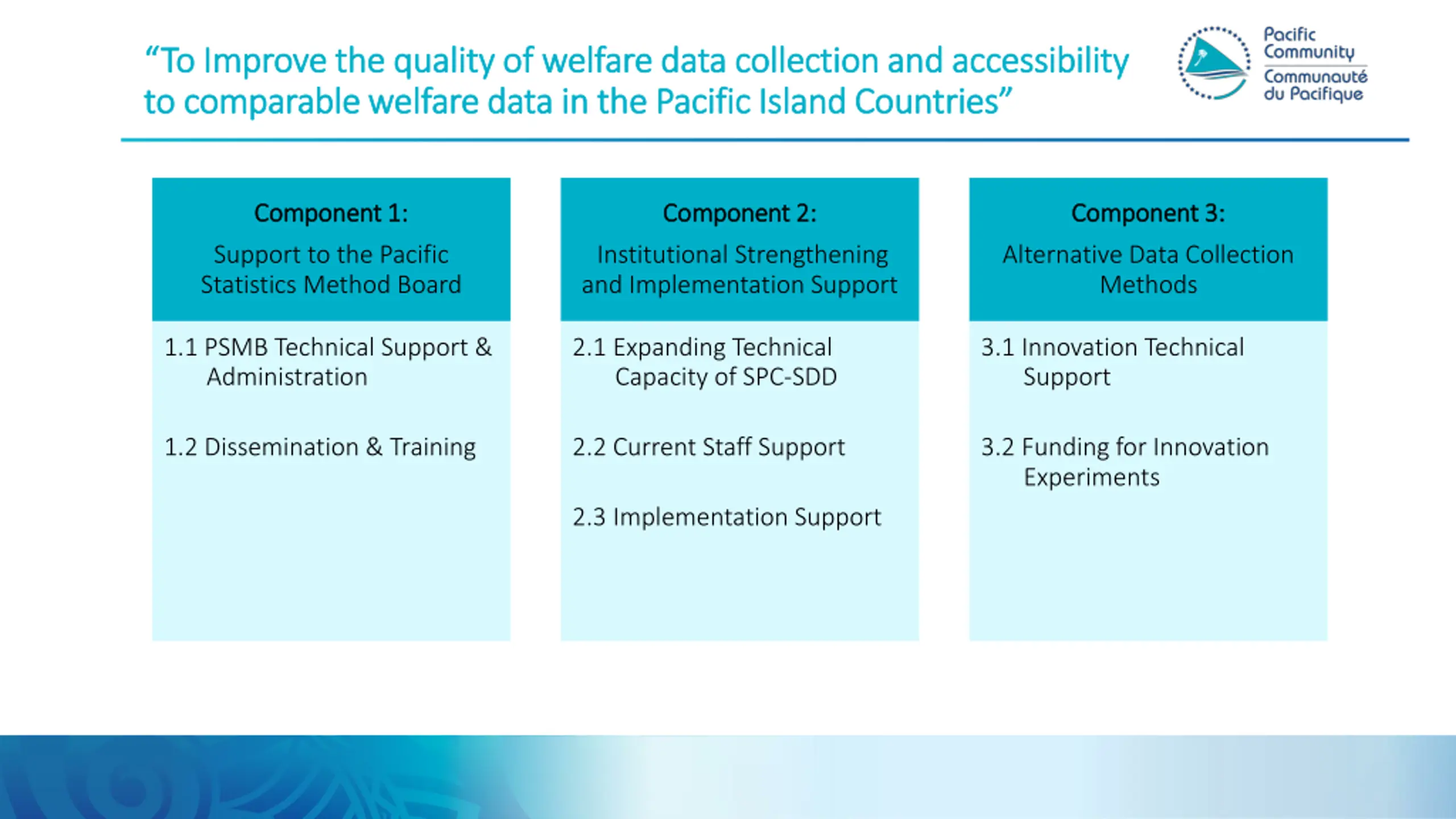 To Improve the quality of welfare data collection and accessibility To Improve the quality of welfare data collection and accessibility to comparable welfare data in the Pacific Island Countries to comparable welfare data in the Pacific Island Countries Component 1: Component 1: Component 2: Component 2: Component 3: Component 3: Support to the Pacific Statistics Method Board Institutional Strengthening and Implementation Support Alternative Data Collection Methods 1.1 PSMB Technical Support & Administration 2.1 Expanding Technical Capacity of SPC-SDD 3.1 Innovation Technical Support 1.2 Dissemination & Training 2.2 Current Staff Support 3.2 Funding for Innovation Experiments 2.3 Implementation Support